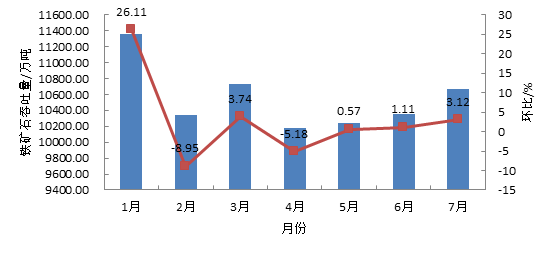 7月铁矿石进口同比小幅增长。根据海关总署的统计数据,7月,我国铁矿石及其精矿进口量9347.6万吨,同比增长2.4%;1—7月,我国铁矿石及其精矿累计进口量66945.6万吨,同比增长6.9%。