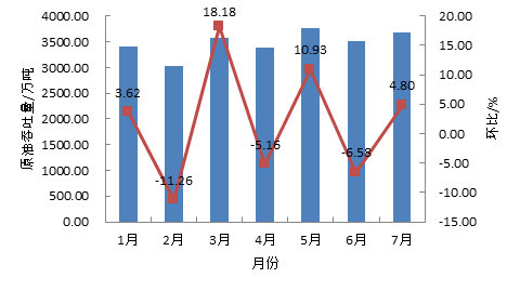7月原油产量小幅增加,进口保持较快增长,原油加工增速加快。根据国家统计局的数据,7月我国生产原油1731万吨,同比增长1.0%;进口原油4369万吨,同比增长17.0%;加工原油6313万吨,同比增长17.4%。1—7月,累计生产原油12237万吨,同比增长1.9%;累计进口原油32575万吨,同比增长12.4%;累计加工原油42671万吨,同比增长10.9%。