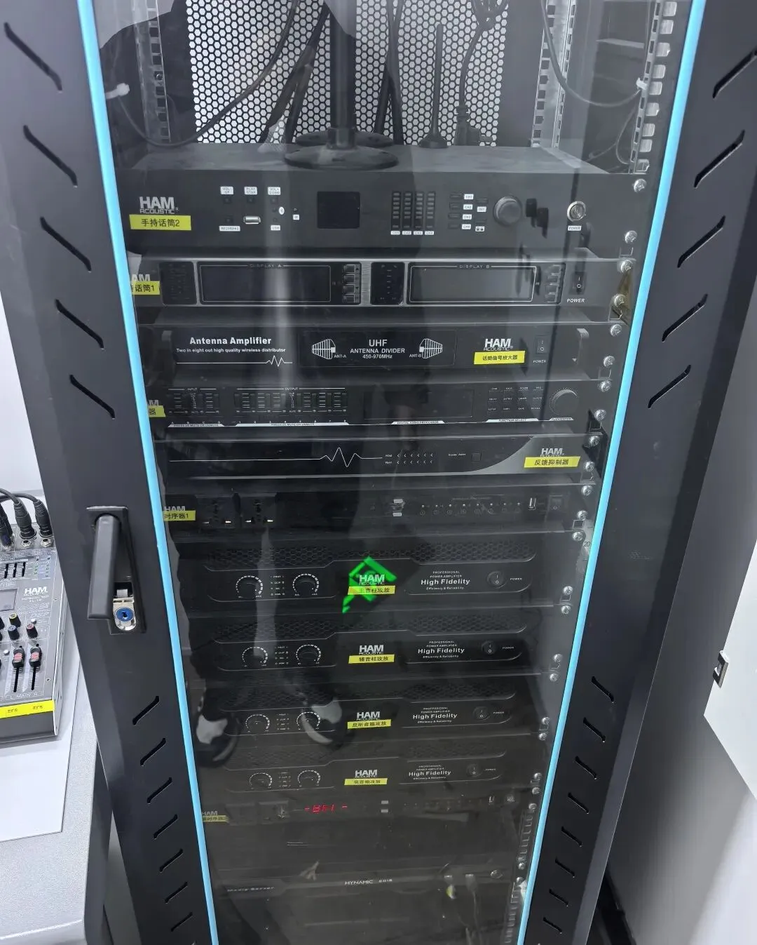 报告厅配置LF210线阵扬声器为主扩,搭配MS18 18寸超低音,返听用MS12M、补声用MS12,由DR系列功率放大器驱动;配套FK-400反馈抑制器、XL-16调音台,杜绝啸叫干扰,适配大型培训、远程会议等场景。