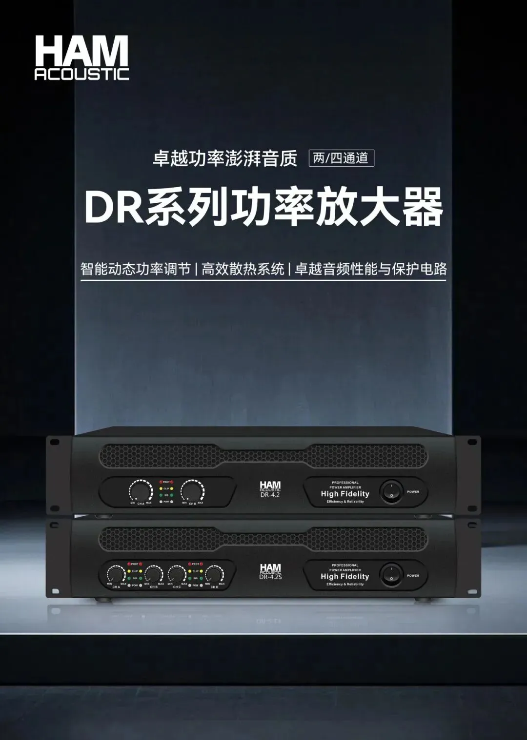 DR系列功率放大器,为全频与超低频单元提供稳定充沛的动力,确保大动态下不失真;