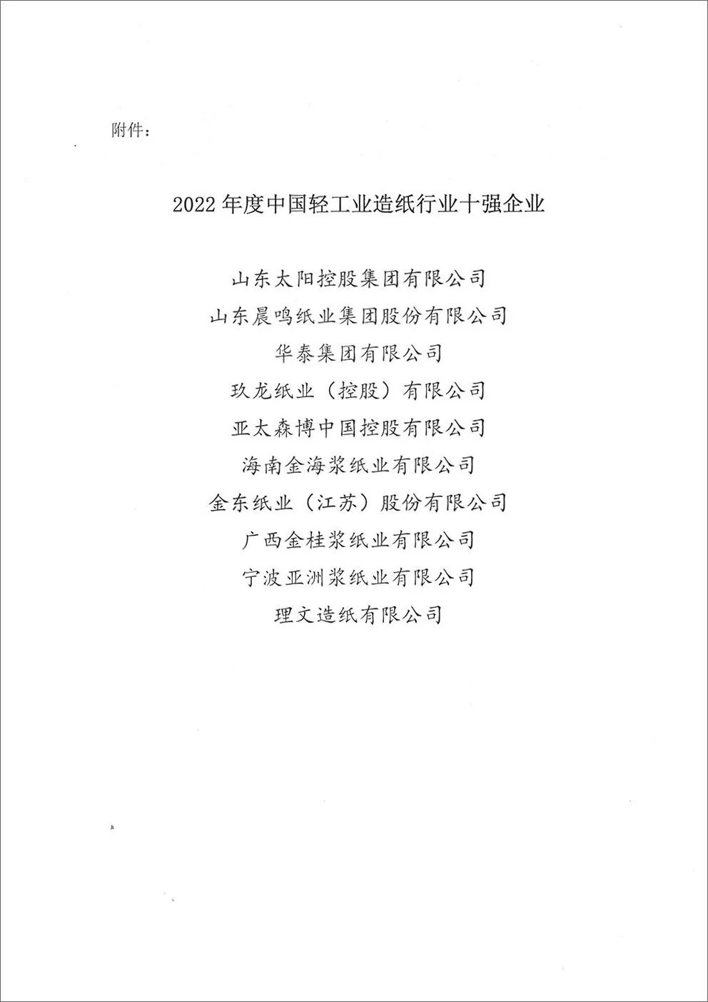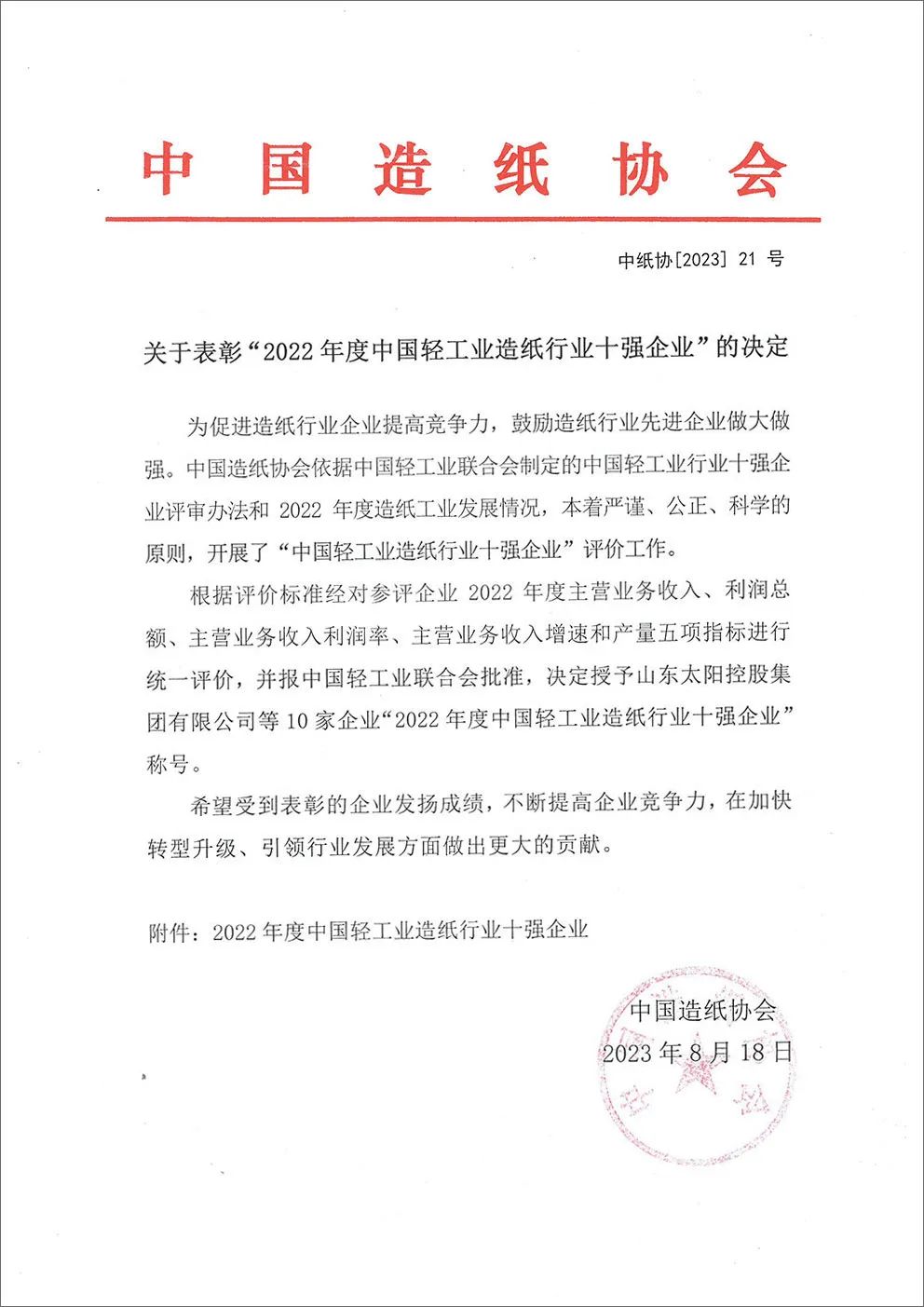 进行统一评价,并报中国轻工业联合会批准,决定授予山东太阳控股集团有限公司等10家企业“2022年度中国轻工业造纸行业十强企业”称号。