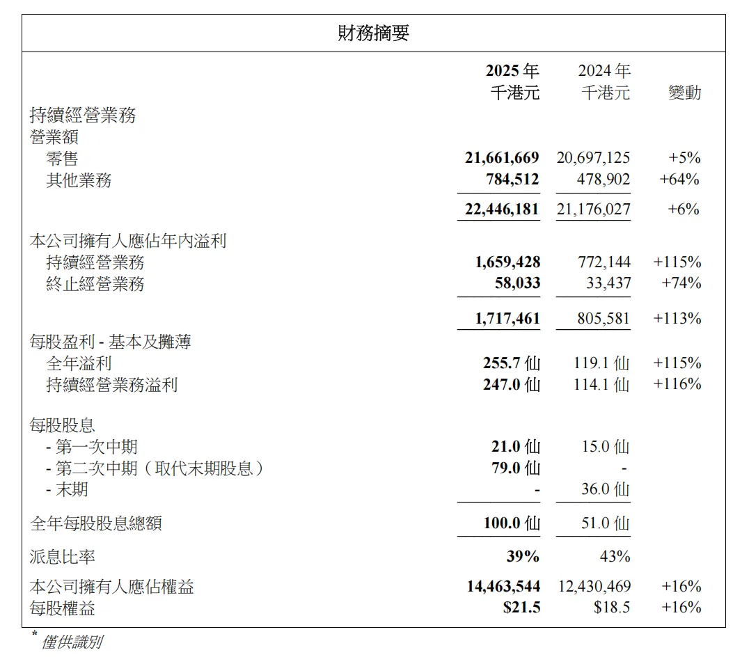 业绩摘要:逆势增长的华丽转身 周生生集团2025年的财报呈现出一份令人瞩目的成绩单,在充满挑战的经营环境中实现了营收和利润的双增长。本集团持续经营业务的综合营业额上升6%至22,446,181千港元,其中珠宝及钟表零售较2024年增长5%至21,661,669千港元。更为亮眼的是利润层面的表现,来自持续经营业务的本公司拥有人应占溢利上升115%,创下1,659,428千港元的历史新高。这一增长不仅反映出金价上涨带来的成本优势,更体现了集团在产品结构调整和成本控制方面的战略执行力。每股盈利也从2024年的119.1仙跃升至255.7仙,增幅高达115%,全年每股股息总额达到100.0仙,较2024年的51.0仙接近翻倍。 财务表现:毛利率显著改善驱动盈利飞跃 深入分析财报数据可以发现,2025年业绩增长的核心驱动力在于毛利率的显著改善。本集团持续经营业务的毛利率上升4.3个百分点至32.6%,这一提升主要归因于两项关键因素。首先是金价上升的正面效应,集团过往以较低成本购入的存货在出售时录得较高利润,这为盈利能力提供了自然支撑。其次是产品结构的优化,集团成功推广毛利率较高的定价黄金饰品,使其在中国大陆和香港及澳门的总销售额中分别占比约26%和14%。这两项因素共同作用,不仅抵消了零售环境充满挑战带来的压力,更为零售分部业绩带来了141%的大幅增长。 成本控制方面的成效同样值得关注。由于持续优化零售网络带来的成本节省,销售及分销费用以及行政费用下降6%。在毛利率改善和成本下降的双重利好下,零售分部的业绩从2024年的1,118,497千港元增长至2025年的2,695,498千港元,增幅达到141%。这一数字充分证明了集团战略调整的有效性,也为未来的持续增长奠定了基础。 地区表现:中国大陆引领增长,香港澳门表现强劲 从地区层面来看,珠宝及钟表零售分部中所有主要地区市场的收益均录得增长,展现出集团业务的韧性。中国大陆市场的收益达到13,818,653千港元,较2024年增长2%,香港及澳门市场的收益为7,388,711千港元,增幅为8%,台湾市场则表现最为抢眼,收益达到454,305千港元,增长37%。分部业绩的增长更为显著,中国大陆分部业绩达到1,701,685千港元,较2024年的637,721千港元增长167%,香港及澳门分部业绩为905,464千港元,较2024年的429,838千港元增长111%,台湾分部业绩为88,349千港元,较2024年的50,938千港元增长73%。 同店销售的增长趋势尤其值得关注。中国大陆和香港及澳门在2025年下半年度均录得同店销售增长上升势头。在香港及澳门,各类黄金产品的需求十分强劲,反映出金价波动反而刺激了市场对黄金产品的关注与需求。中国大陆的同店销售增长则呈现持续改善趋势,受惠于2025年下半年度计价产品的需求有所改善,以及高端商圈分店录得强劲的同店销售增长。这一分化现象表明,不同地区市场的消费行为和偏好存在差异,集团需要根据各地特点采取差异化的经营策略。 战略调整:网络优化与全渠道发展 2025年,周生生集团在战略层面进行了重要的网络优化调整。年内,集团持续推行零售店网络整合策略,在中国大陆,集团于关键策略性地段开设了31家分店,主要位于二线或以上城市,同时关闭了146家未能配合集团策略方向的分店,净减少115家分店。这一调整体现了集团从规模扩张向质量提升的战略转变。在香港,集团在尖沙咀广东道增加了1家周生生分店,澳门的点睛品分店数目为7家,在台湾开设了4家新店,包括3家点睛品分店和1家PROMESSA分店。 这种审慎而有纪律的网络优化做法有助于资本的有效配置,从而提升成本效益及盈利能力,同时维持集团的市场覆盖及竞争定位。截至2025年12月31日,珠宝零售合记分店数为825家,较2024年12月31日的939家减少114家,钟錶零售合记分店数为15家,较2024年的19家减少4家,分店合计从958家减少至840家。 全渠道策略的持续推进为集团的发展提供了新的增长动力。全渠道销售占总零售销售百分比为23%,与2024年持平,但各地区存在差异。中国大陆的全渠道销售占比为31%,香港、澳门、台湾及其他地区为6%。线上销售方面,中国大陆的线上销售为3,364百万港元,较2024年的2,967百万港元增长13%,香港、台湾及其他海外市场的线上销售为402百万港元,较2024年的310百万港元增长30%。中国大陆的线上销售占中国大陆总销售约24%,较2024年的22%有所提升。集团透过第三方电子商贸平台合作夥伴以及自家渠道,结合自家及外聘主播,举办超过2,400场直播活动,累计时数约30,000小时,较2024年的26,000小时有显著增加。 财务状况:稳健的资本结构和充裕的流动资金 从财务状况来看,周生生集团展现出稳健的资本结构和充裕的流动资金。于2025年12月31日,本集团现金及等同现金为978,288千港元,较2024年的1,335,827千港元有所下降,但这主要是因为集团进行了股份购回和优化现金管理。本集团获得约13,816百万港元的银行融资支持,包括银行贷款及贵金屬借貸,其中728百万港元为保证融资。未动用之银行融资总额为6,183百万港元,与2024年持平。 于2025年12月31日,本集团总银行贷款及贵金屬借貸分别为1,753百万港元及5,658百万港元,按本集团政策以无抵押方式取得。按总银行贷款及贵金屬借貸扣除现金及等同现金后的净额为6,433百万港元,以本公司拥有人应占权益14,464百万港元为基准,净资本负债比率为44.5%,处于合理水平。本集团的流动比率为2.3,显示出良好的短期偿债能力。 在风险管理方面,集团采取