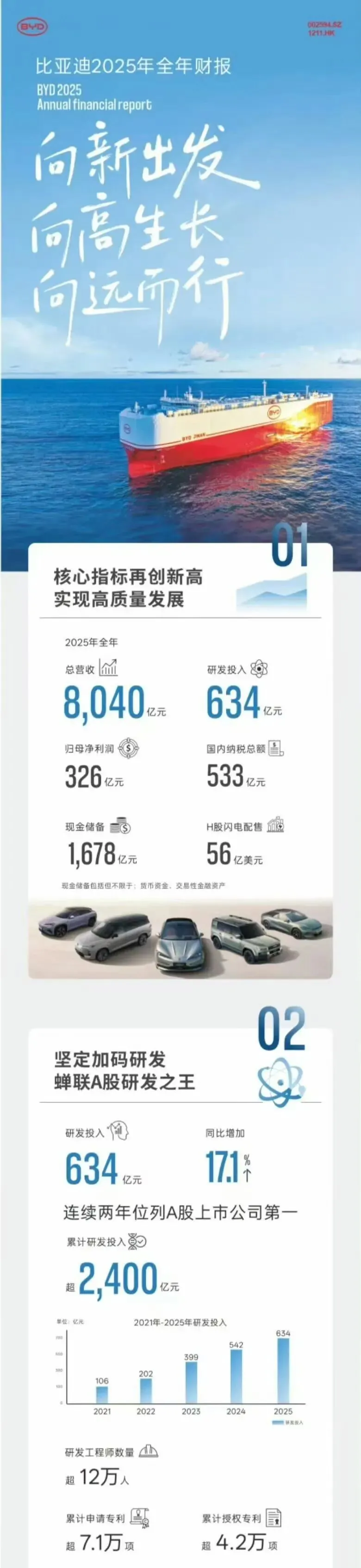 比亚迪刚刚公布了2025年全年财报。研发投入634亿,同比增加17.1%,连续两年位列A股上市公司第一。