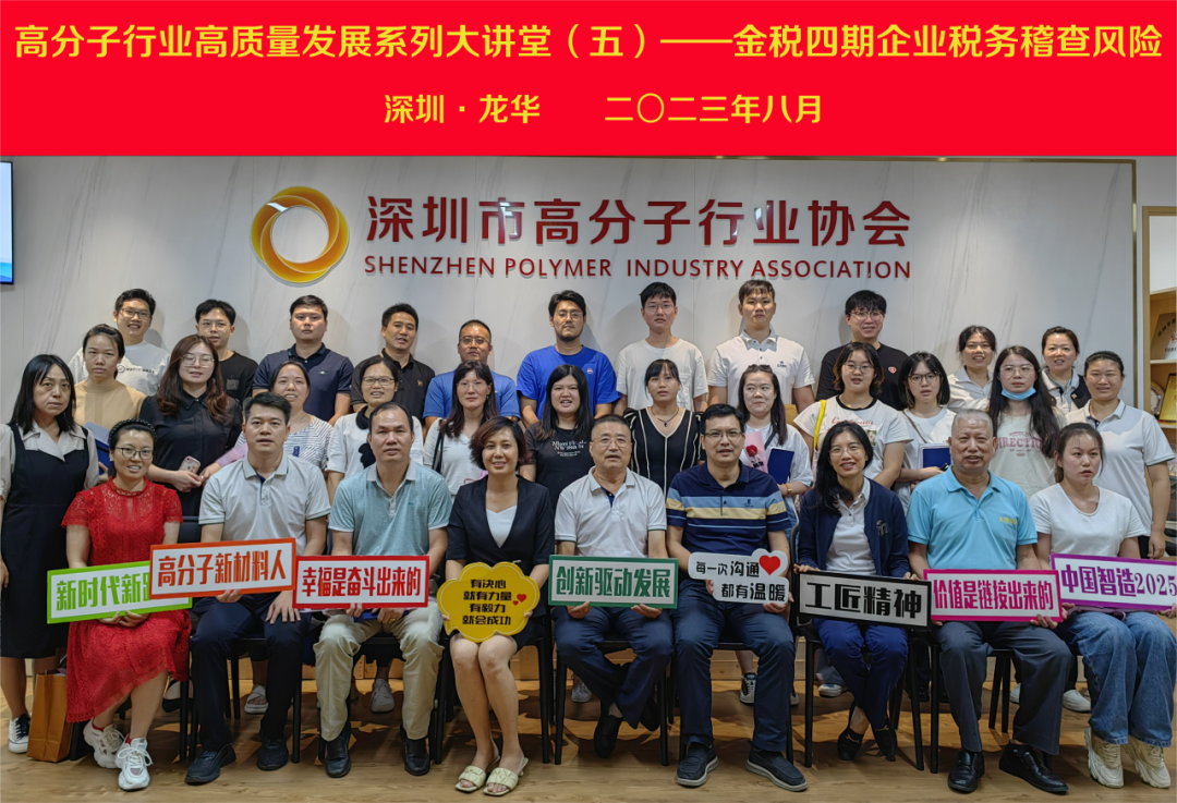 为响应政府高质量发展号召,紧跟时代高质量发展步伐,2023年8月22日下午,由深圳市高分子行业协会主办的”高分子行业高质量发展系列大讲堂(五)——企业税务稽查风险“活动在深圳市龙华区协会会员之家顺利召开,协会会亲50余人出席会议,共同学习“金税四期”相关的最新政策变化,提升涉税合规能力。会议由深高协媒体运营部副部长叶思佳主持。