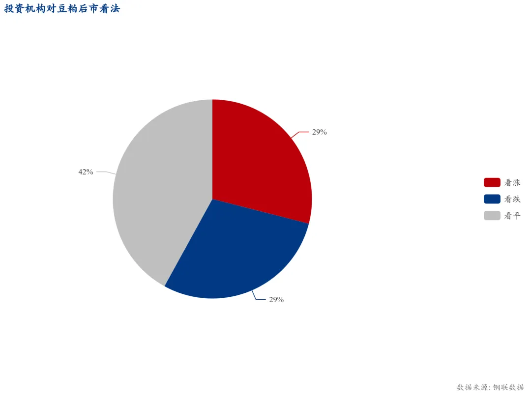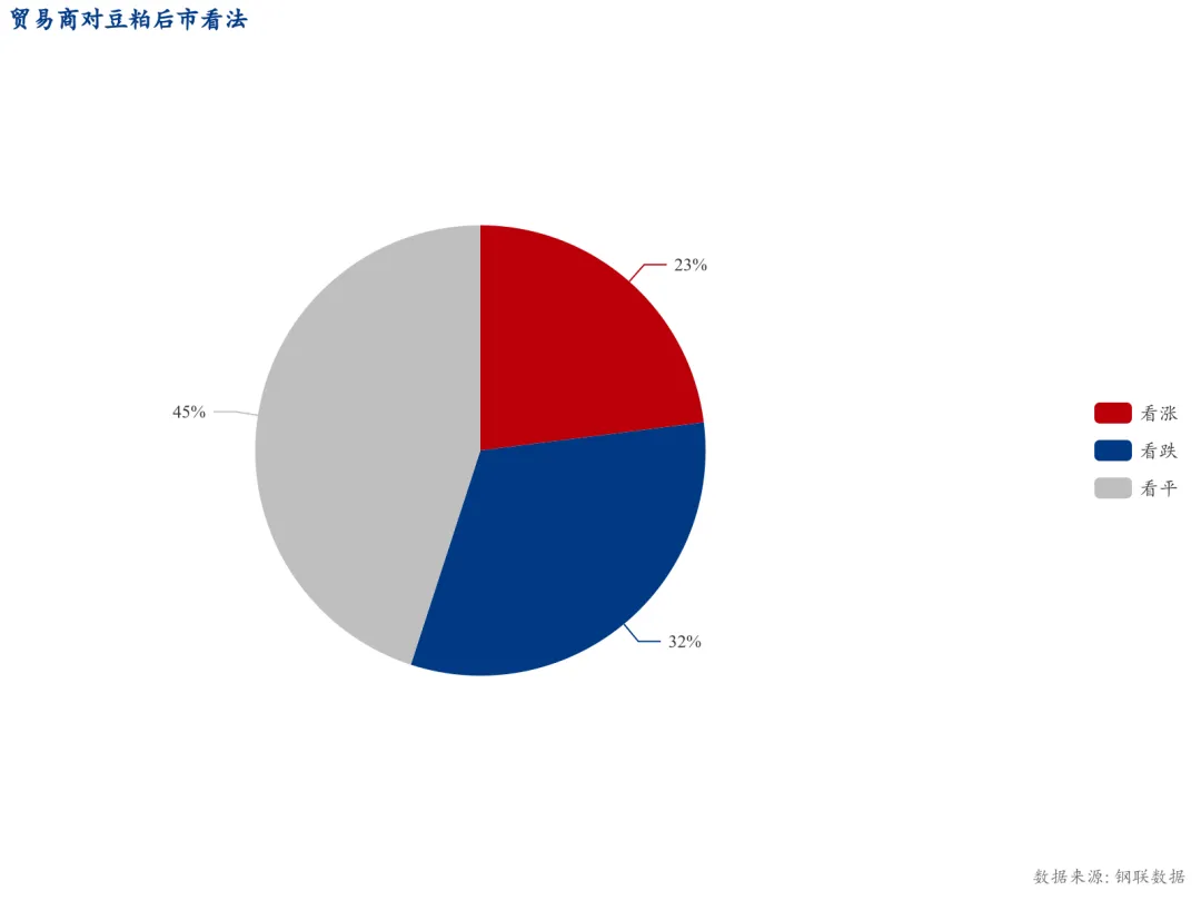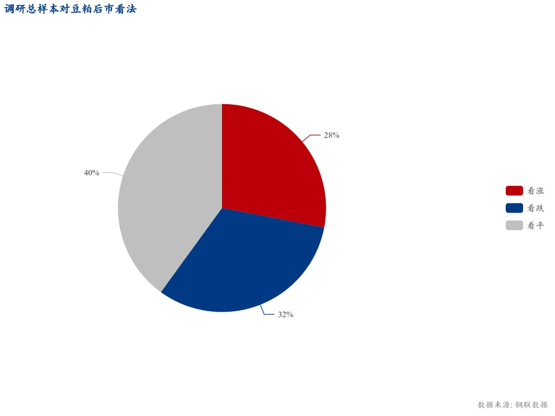 结果显示,全样本中,认为下周国内豆粕现货市场上涨的占比为28%,较上一周减少12个百分点,认为下周市场下跌的占比为32%,较上一周增加9个百分点,认为下周市场持稳的占比为40%,较上一周增加3个百分点。