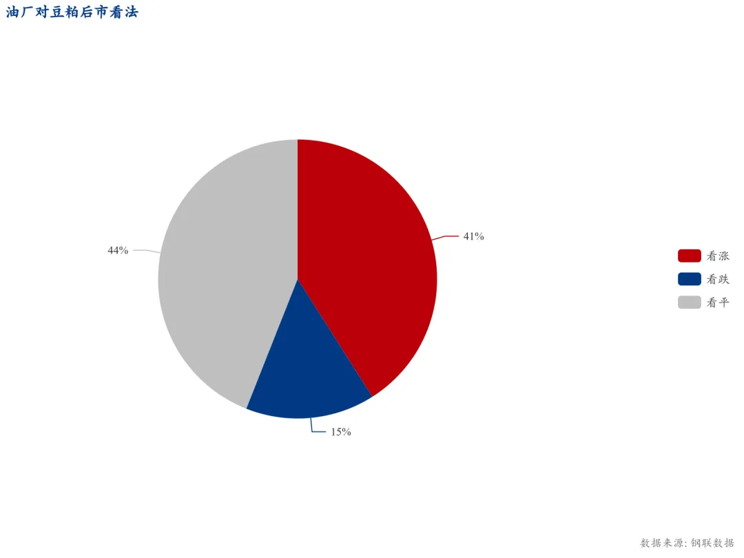 具体来看,油厂方面,对下周市场看涨占比41%,较上一周减少15个百分点;看跌占比15%,较上一周增加3个百分点;看盘整占比44%,较上一周增加12个百分点。