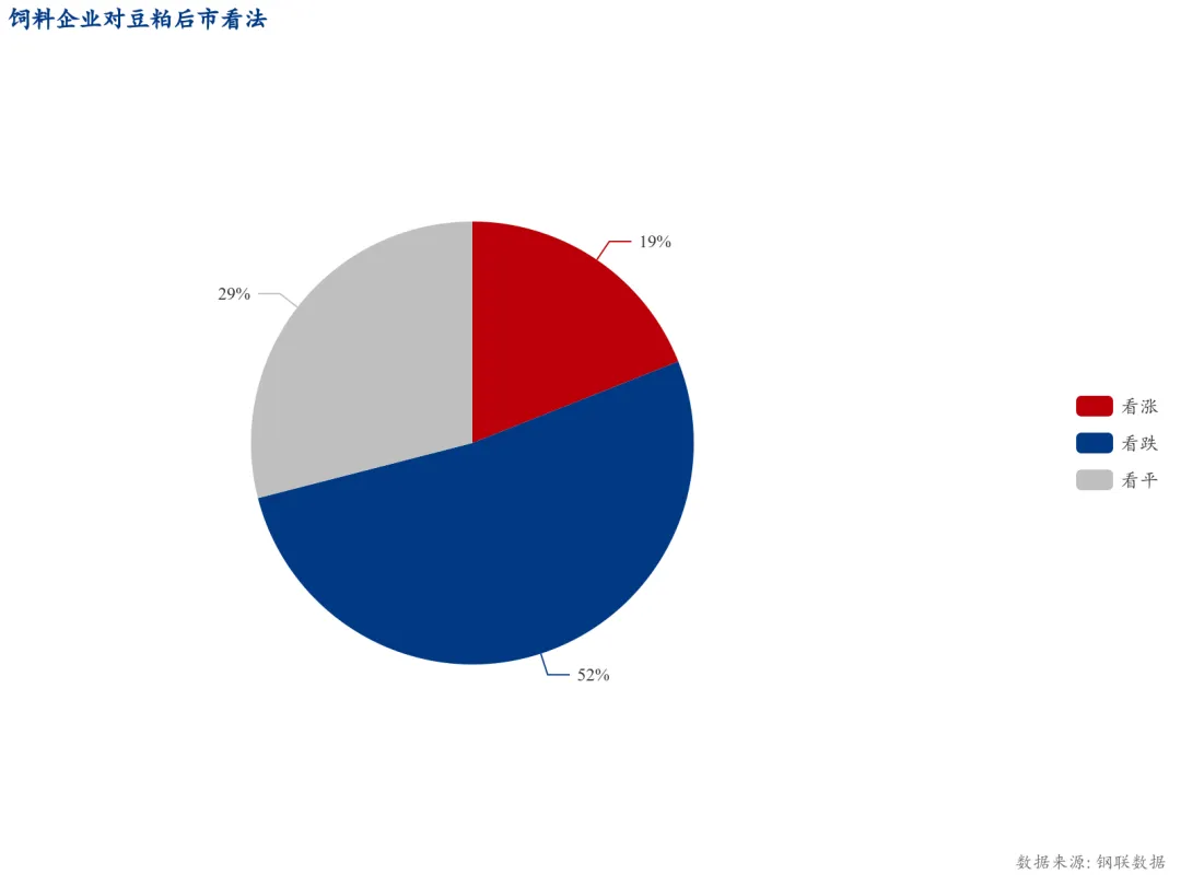 饲料企业方面,对下周市场看涨占比19%,较上一周减少7个百分点;看跌占比52%,较上一周增加20个百分点;看盘整占比29%,较上一周减少13个百分点。