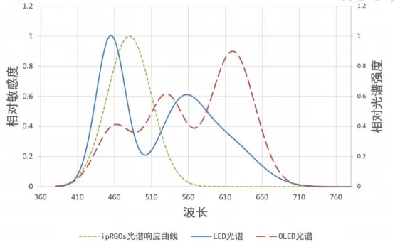 在物理光学领域,对光生物健康的研究自 1924 年就已经起步,随着 LED 光源的出现及其广泛应用,相关研究一直在持续开展,也取得了一些极具参考价值的研究成果,为开展针对消费电子产品的视觉友好评价研究提供了参考。相关研究表明,低频蓝光对人视觉及其它生物学指标的影响更加显著,而消费电子产品(如智能手机、平板电脑、电视、笔记本电脑等)所使用的显示屏广泛采用液晶显示(LCD)配合 LED 背光或 OLED 自发光显示技术,其中 LED 背光由于其能效高、成本低、色彩还原度强而被广泛应用。然而,LED发光光谱中通常包含强烈的蓝光峰值,其主波长集中在450–470 纳米之间,正好落在激活 ipRGCs(内在光敏感视网膜神经节细胞)及影响褪黑素分泌的敏感区间(图 1),尤其是在夜间或昏暗环境中使用高亮度电子屏幕,会导致ipRGCs 在非自然的时间段内被激活,造成生理节律紊乱,形成所谓的“夜间蓝光干扰”。这在青少年、夜班工作者以及睡眠障碍人群中尤为突出。