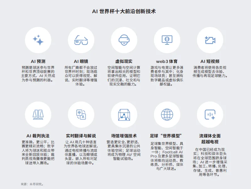 2026年夏季,由美国、加拿大、墨西哥联合举办的足球世界杯将迎来赛事百年历史上的里程碑时刻——这是首届全面由AI赋能的世界杯,也是世界杯赛事自创办以来规模空前的人类盛事与全球顶级科技事件。本届赛事迎来48支参赛球队、104场正式比赛、39天超长赛事周期的全新规模,国际足联官方数据预测,全球赛事视频观看总人数将达到60亿,与全球手机上网人数基本持平,决赛直播观众规模将突破20亿,与预计的全球AI使用人数完全匹配,赛事现场观赛人数预计将达到700万,数字技术让全球体验赛事的人数实现了上千倍的放大。本届世界杯最核心的突破,是国际足联首次打破主办国主导赛事技术体系的传统模式,与联想集团达成深度技术合作,联合搭建世界杯全栈AI技术底座,构建起端边云网一体化的超大规模混合架构,全面覆盖16座主办城市的赛事场馆。本届赛事正式推出三大核心AI技术,分别是VAR 3D数字人可视化方案、足球AI超级智能体Football AI Pro、裁判视角AI视频增强系统,三大技术全面覆盖赛事判罚、战术分析、观赛体验三大核心场景,正式开启AI赋能足球的全新时代。其中VAR 3D数字人可视化方案通过对参赛球员的全身高精度扫描,实现毫米级的越位判罚精度,同时用逼真的球员3D形象替代传统通用人形模型,大幅提升观众对判罚的理解度,未来还将拓展至战术分析、AR沉浸式观赛、足球电竞等场景;Football AI Pro作为足球“世界模型”的首个落地产品,可实时采集赛场全维度数据,为球队教练与球员提供动态战术分析,后续还将向全球球迷开放多模态功能;裁判视角AI视频增强系统在2025年世俱杯完成试运行,2026年世界杯将通过联想AI技术优化画面质量,为全球球迷提供赛场第一视角的沉浸式观赛体验。2026年世界杯将成为全球首个赛事数据规模跨越PB、EB、千万亿token三大数量级门槛的体育赛事,同时也是对全球AI基础设施的一次极限压力测试。官方测算数据显示,本届赛事FIFA官方集中采集的场内技术数据与赛事视频总量接近8PB,其中首次引入的球员数字人相关数据超700GB;现场观众赛事相关数据流量接近4PB,是2022卡塔尔世界杯的4倍;为全球场外观众提供赛事转播的流媒体内容分发网络,将在赛事期间传输1-2EB的超大规模数据。在AI算力层面,世界杯期间全球日均token消耗将达到535万亿以上,其中仅世界杯相关的个人AI用户每日token消耗就达15.84万亿,占全球AI算力需求的3%,整个赛事周期用户额外消耗的token总量接近千万亿级别;赛事期间AI持续吞吐能力平均达到2.16亿tokens/秒,决赛等关键比赛峰值将攀升2-3倍,对应需要约86–130MW的GB200级算力,或GW级的H200级算力资源,规模可类比百万张H200显卡构成的算力集群。AI已全面渗透顶级足球俱乐部训练、比赛、运营全链路,形成完整的数据商业闭环。目前全球顶级足球俱乐部均已搭建专业的AI数据分析团队,其中英超联赛的智能化布局处于全球领先地位,前六名英超球队平均配备15名专业数据分析师,而英乙联赛球队平均仅配备1名分析师,层级差异显著。顶级俱乐部的AI核心岗位,多由物理学、计算机科学、人工智能领域的博士担任,利物浦、切尔西、曼联、阿森纳等豪门均搭建了行业顶尖的数据科学团队,核心人员不乏来自欧洲核子研究中心、F1车队等跨领域顶尖机构的技术专家。行业数据显示,AI技术已实现从球员青训、伤病预测、战术制定到商业运营的全链路覆盖,形成“赛事精彩度提升-商业价值扩大-技术投入增加”的良性循环,英国足球行业预测,未来2年内,传统球探的核心人才挖掘工作将大概率被AI技术替代。本届世界杯的技术栈迎来前所未有的扩容,48家全球顶尖AI与科技公司深度参与赛事全流程,与48支参赛球队形成对应,构建起覆盖算力通信、裁判判罚、训练运营、球迷体验四大核心领域的完整足球科技生态。其中既包括谷歌、微软、亚马逊、甲骨文等全球算力基础设施巨头,也有阿迪达斯、鹰眼等深耕赛事技术多年的专业服务商,中国企业瑞盖科技研发的“中国鹰眼”系统已获得FIFA官方认证,成为赛事裁判技术体系的重要组成部分。与此同时,足球场已成为具身智能、多智能体协同AI前沿研究的终极试验场,谷歌DeepMind与利物浦足球俱乐部长期合作,开发足球战术AI助手TacticAI,用强化学习、博弈论等技术深度解构足球战术体系;2025年世界人形机器人运动会上,清华火神队1:0战胜德国联队,夺得全球首个5V5人形机器人足球赛冠军,足球场景验证的AI技术正快速向家庭陪护、工业物流等实体产业领域迁移。FIFA正通过技术共享与开源,实现足球技术平权与AI普惠,目前VAR技术已推广至全球80多个国家和地区的上千场足球赛事,FIFA Forward 3.0计划持续将顶级赛事的AI技术向全球基层足球场景下沉,让更多草根球队、业余赛事获得专业的技术支持。而中国已成为本届世界杯全球最大的AI应用场景,2022卡塔尔世界杯数据显示,中国在全球数字和社交平台的赛事观看时长占比高达49.8%,决赛数字流媒体观看时长占全球61.9%,首次超过传统电视观看时长,预计2026年中国用户世界杯相关AI token消耗将占据全球半数以上。与此同时,中国民间足球迎来爆发式增长,省级足球联赛已汇聚约485支地方球队,参赛球员近1.5万人,全年赛事超1800场,成为中国足球AI技术落地的规模化试验场。联想集团不仅是FIFA世界杯官方技术合作伙伴,还成为广东省超联赛官方