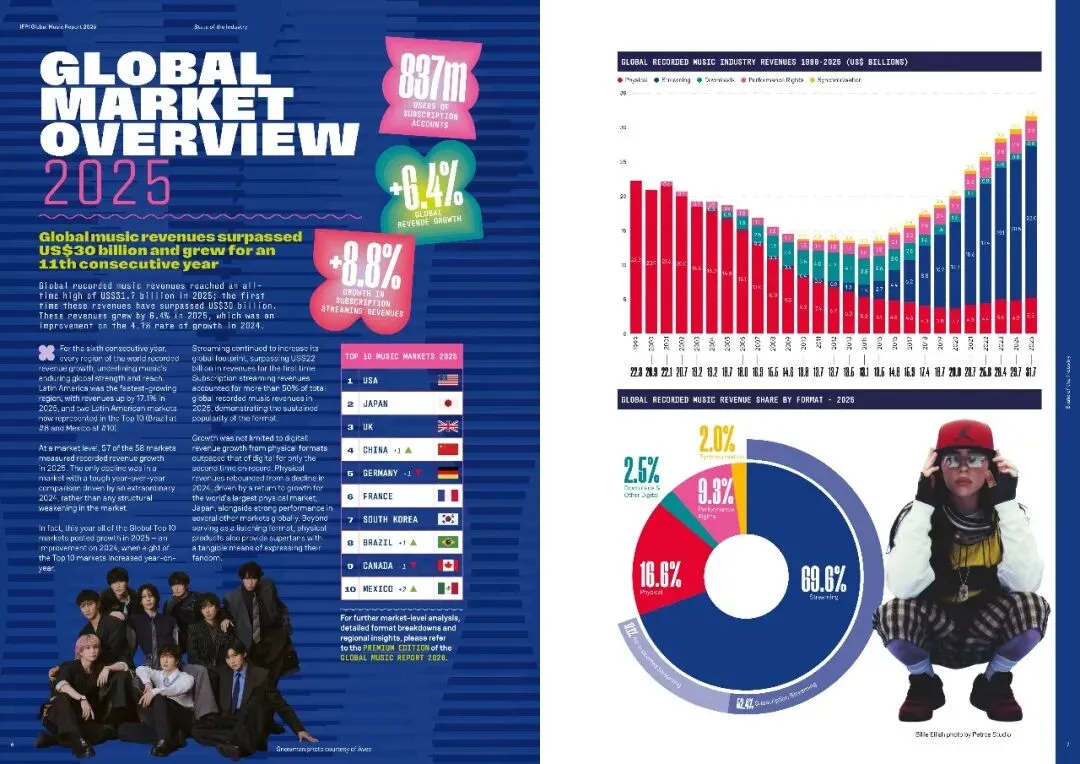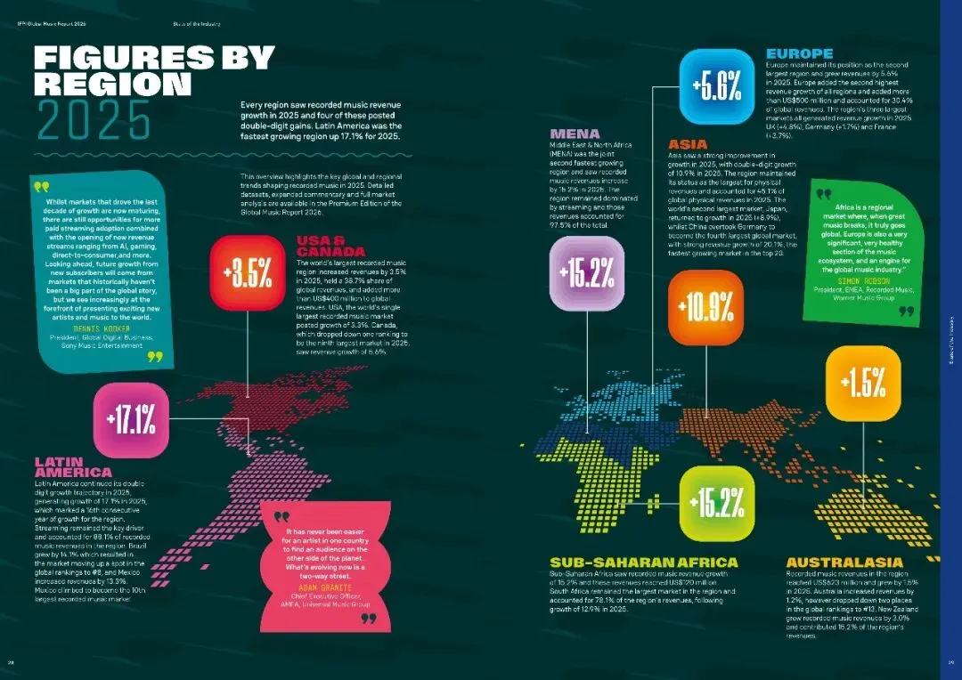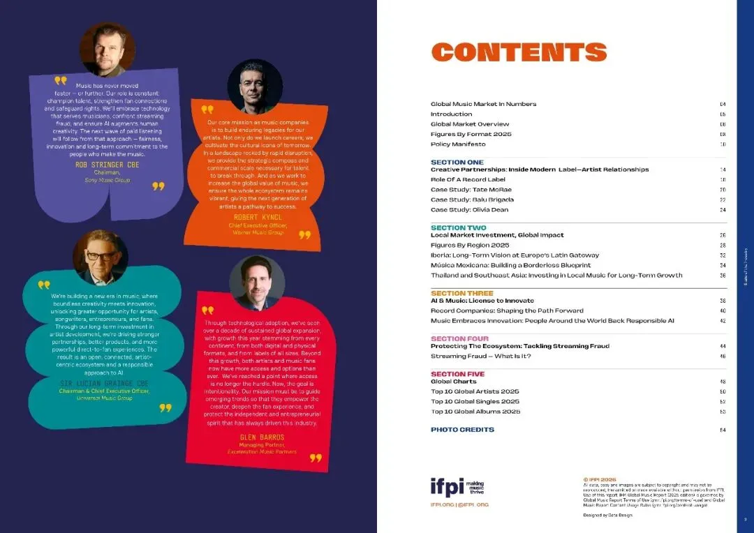 全球音乐市场持续增长,2025年总收入超317亿美元,同比增长6.4%,其中流媒体收入增长8.8%,成为主要驱动力。拉丁美洲市场增速最快,巴西和墨西哥跻身全球前十。报告强调版权保护对音乐产业经济和文化价值的重要性,呼吁政府维持版权法律的确定性。