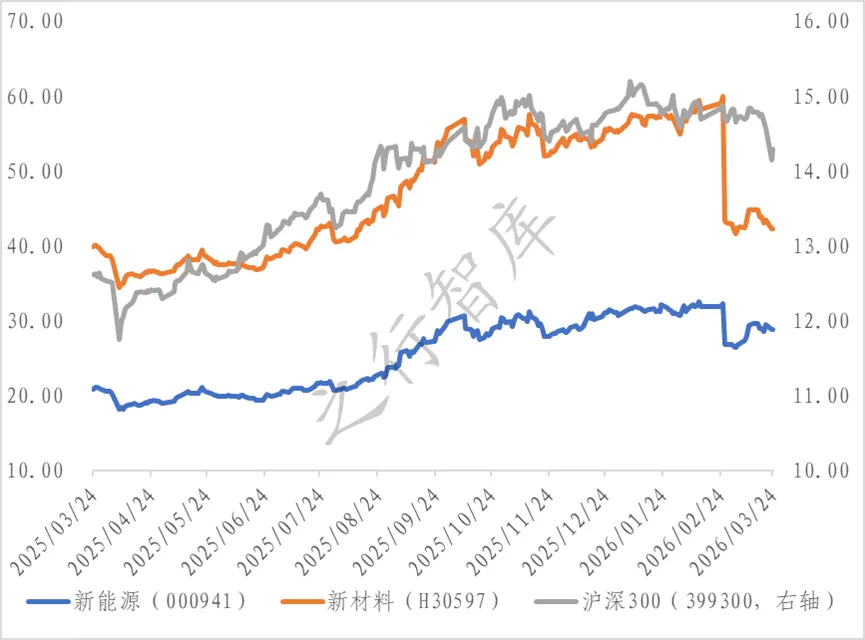 1.估值动态:本期(2026.2.26-2026.3.24,下同)绿色发展领域代表性指数估值有升有降,其中新能源指数估值涨幅约7.4%,新材料指数估值下跌约2.4% 。根据iFinD数据显示,截至2026年3月24日,绿色发展领域重要代表性指数新能源行业估值为28.81倍,较2026年2月26日上涨7.4%;新材料行业估值为42.2倍,较2026年2月26日下跌2.4%;同期,沪深300指数估值下跌2.7%,弱于新能源和新材料指数估值走势。