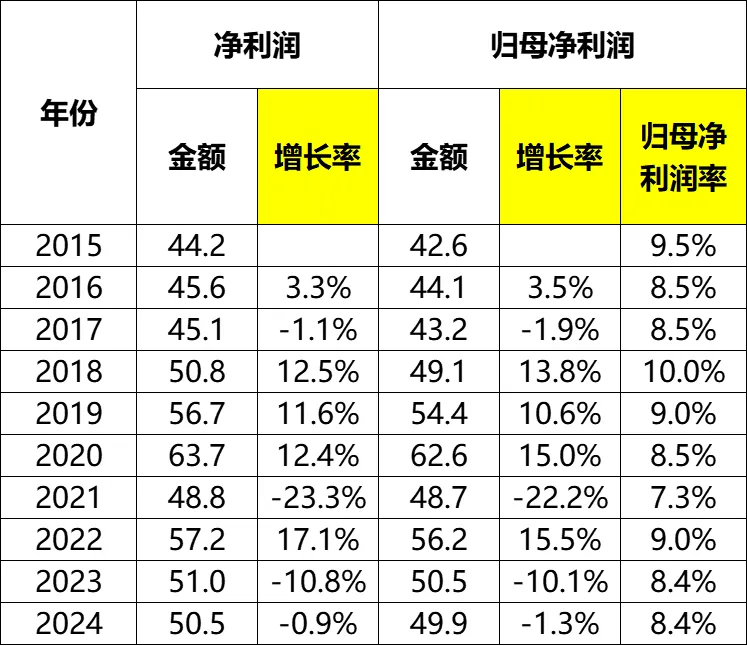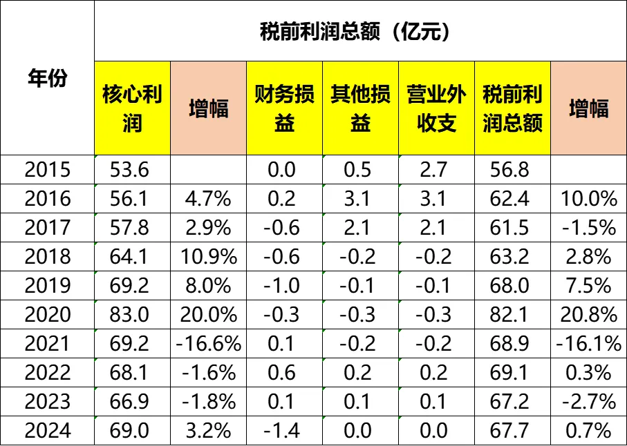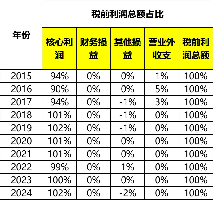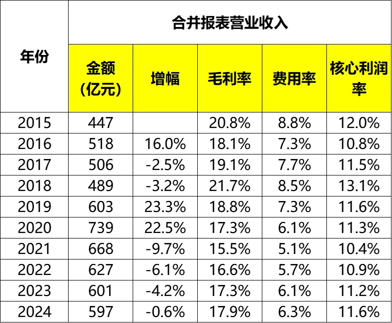 核心利润率方面(毛利率-费用率)基本稳定吧,2015~2024年期间介于10.4%~13.1%之间,2024年为11.6%。