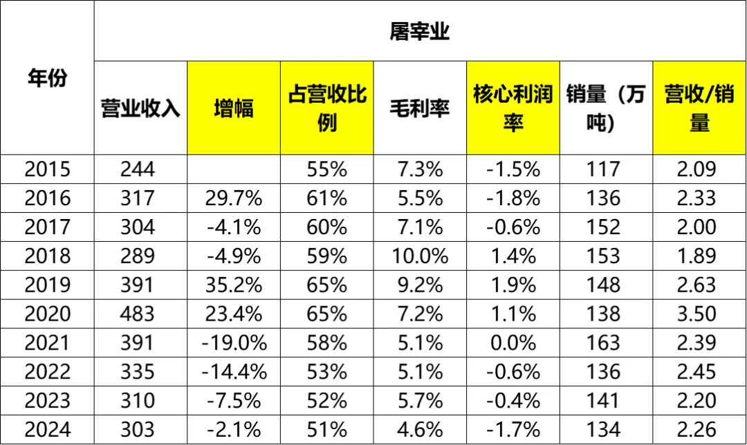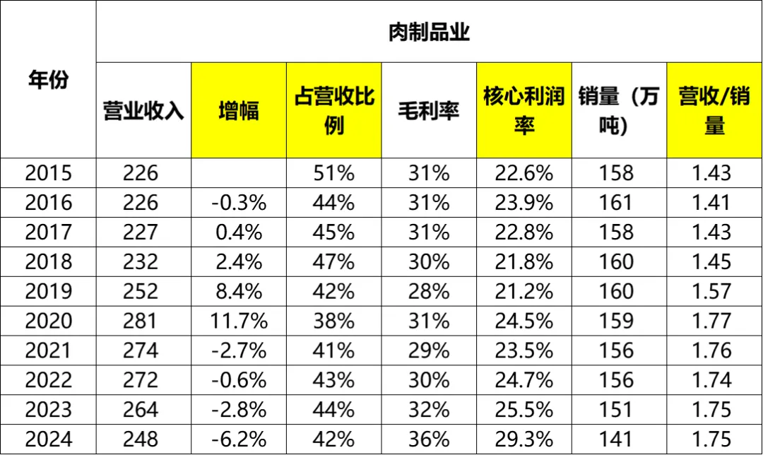 虽然肉制品营业收入没什么增长,但是占总营收的比例却从2015年的38%增加到了2024年的55%。