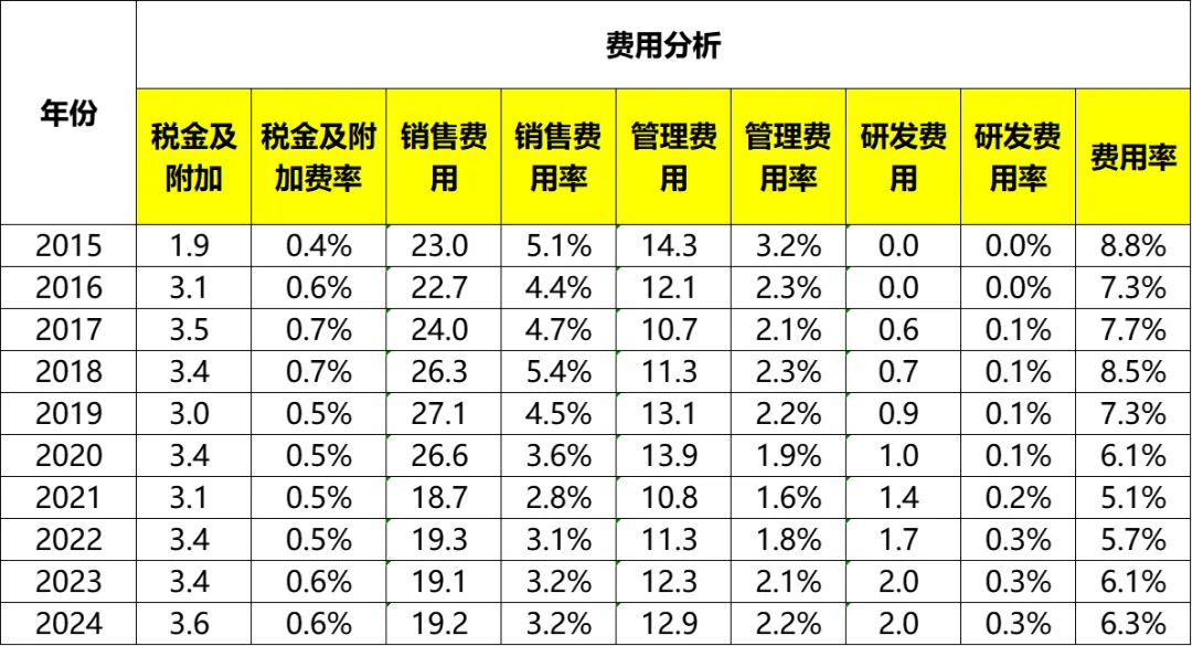 费用率方面(税金及附加、销售、管理、营销费用),从2015年的8.8%波动下降到2021年的5.1%之后开始回升,截至2024年为6.3%。