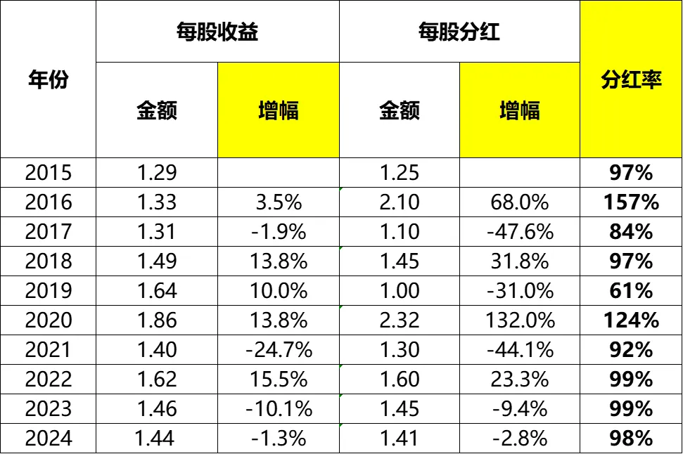 2015~2024年间平均达到100%,这是一个非常高的分红率,至于是否可持续,我已经有专门文章写过,此处不赘述了。
