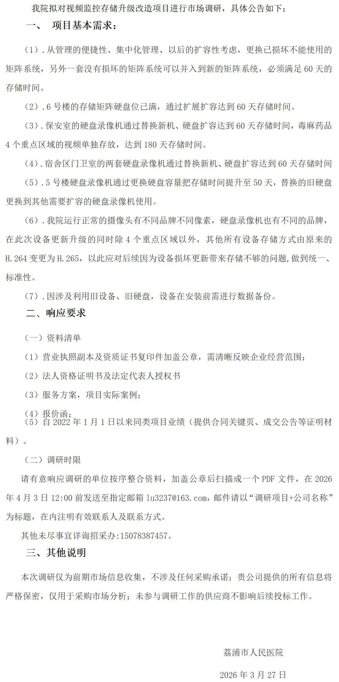 荔浦市人民医院视频监控存储升级改造项目市场调研公告