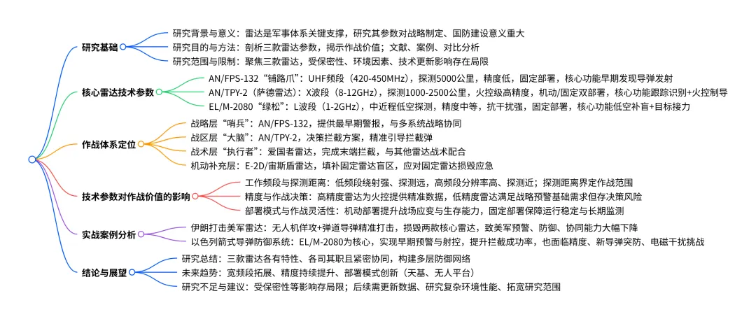 本研究以AN/FPS-132 “铺路爪”、AN/TPY-2(萨德雷达)、EL/M-2080 “绿松”三款典型军用雷达为核心,通过文献研究、案例分析和对比分析方法,剖析了其工作频段、探测距离、精度、部署模式等核心技术参数及作战功能,明确了三款雷达分别作为战略层 “哨兵”、战区层 “大脑”、低空防御核心的作战体系定位,同时探究了技术参数对作战价值的影响,并结合伊朗打击美军雷达、以色列箭式导弹防御系统两个实战案例验证了雷达性能与作战应用的关联,最后展望了雷达技术宽频段拓展、精度持续提升、部署模式创新的未来发展趋势,也指出了研究因军事技术保密性存在的局限性并提出后续研究建议。