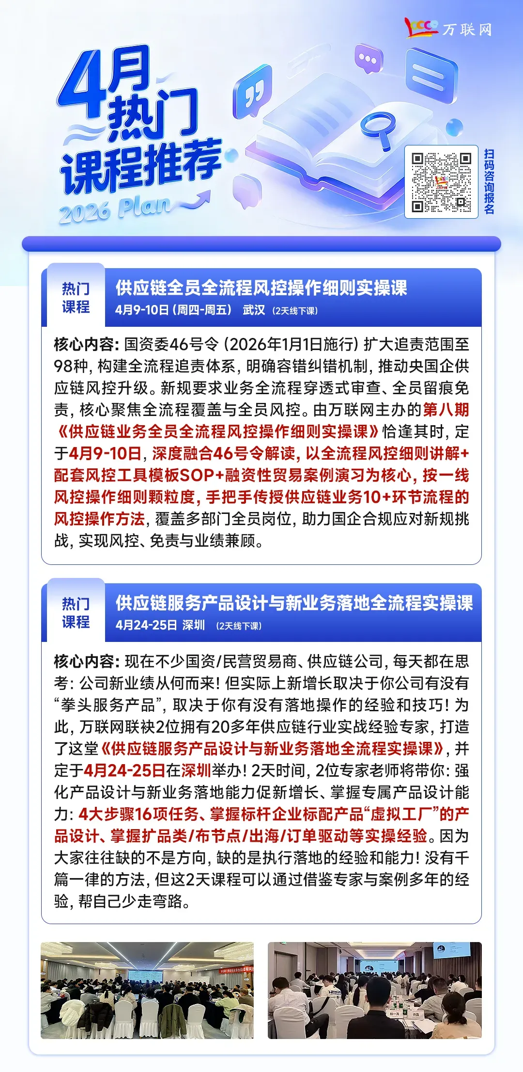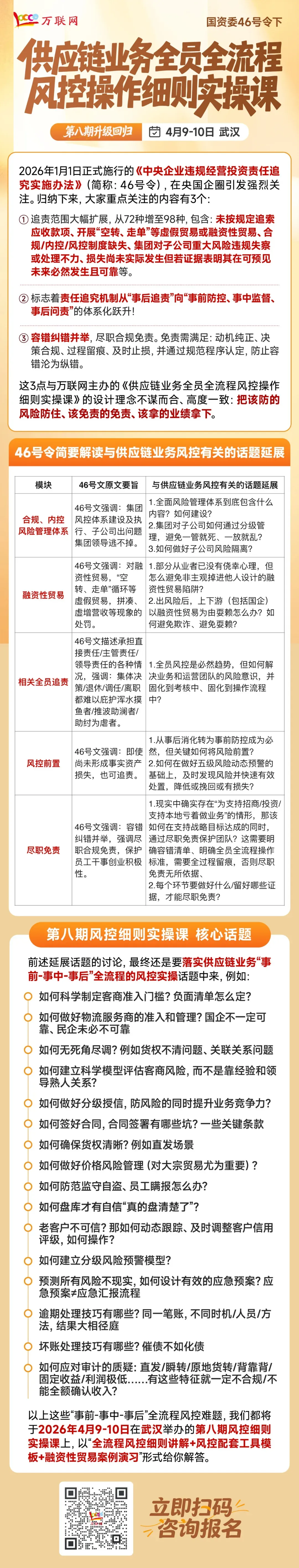 为助力国企贸易公司更加合规、低风险地完成营收、拓展利润,2026年4月9-10日,万联网计划在武汉举办第八期《供应链业务全员全流程风控操作细则实操课》。这个系列课程目前已开班七期,累计吸引了700多位来自近300家大型国企集团的高管组团报名,口碑载道。