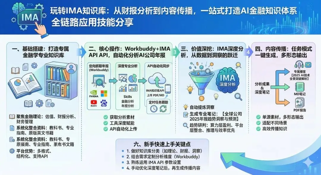 在AI与金融深度融合的当下,如何高效整合金融专业知识、自动化分析行业财报,并将分析成果快速转化为多形态内容传播?我在IMA平台的实操经历或许能给你答案。从搭建专属金融学知识库,到用Workbuddy自动化分析全球AI公司年报,再到借助IMA的功能实现从笔记到播客的内容闭环,一套流程下来,让知识管理和行业分析效率翻倍。今天就把这套IMA全链路应用技能分享给大家,新手也能轻松上手!