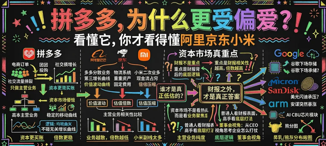 拼多多为什么被资本青睐?因为它足够专注;阿里为什么讲再多新故事市场也未必买账?因为相关性不够高;小米为什么倍数会被砍?因为负线业务拖累主业资金;存储板块为什么不能只看消息?因为真假消息背后,真正决定胜负的是产业逻辑。
