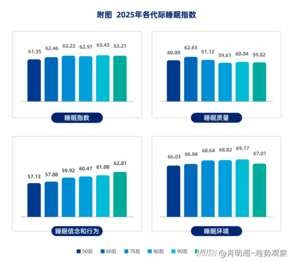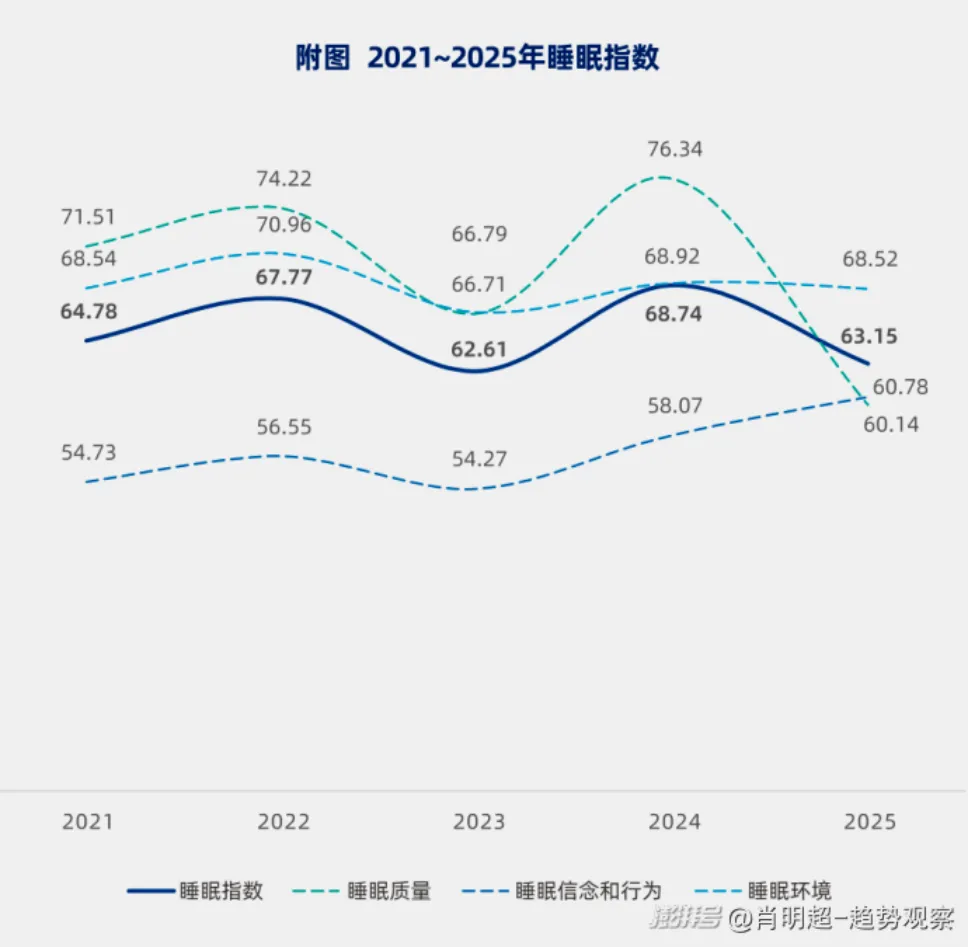 相关数据指出,2024年中国睡眠指数达到68.74分的峰值,2025年直接回落至63.15分;其中睡眠质量得分骤降至60.14,是2021年以来的最低值。