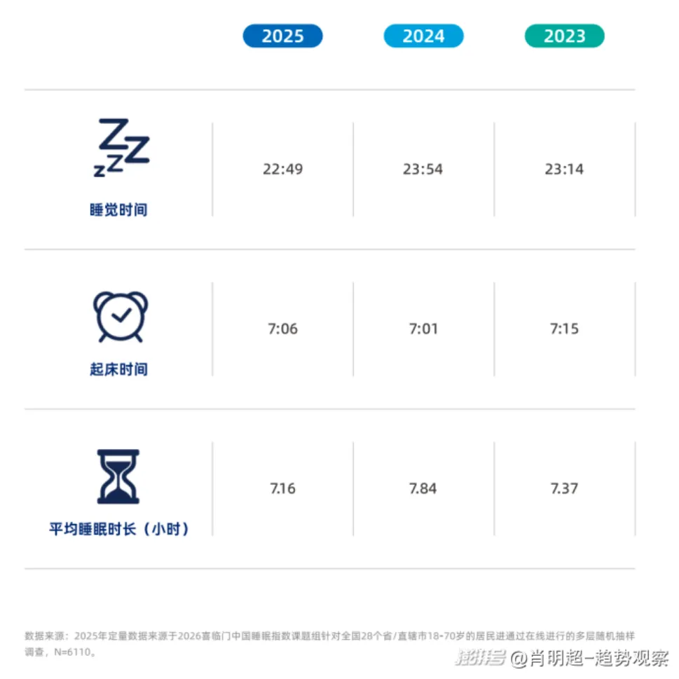 《喜临门中国睡眠指数报告》指出,如今,大家的睡眠时间越来越少,如从2024年的7.84小时,缩减至2025年的7.16小时(低于2023年水平,平均上床时间提前到22:49,起床时间推迟到7:06)。