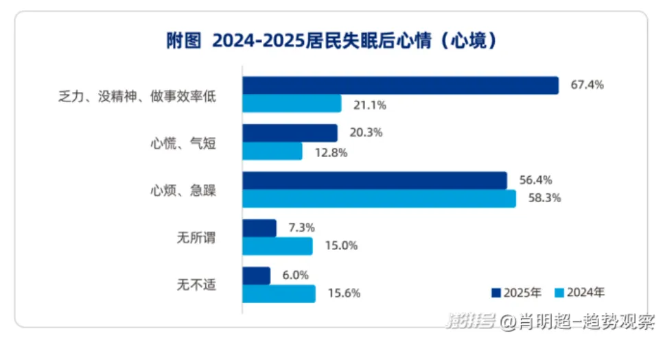 匹兹堡睡眠质量指数显示,睡眠不佳直接拖垮白天状态:67.4%的人出现乏力、效率低下,56.4%的人心烦急躁,60.4%的人全天疲劳不堪。