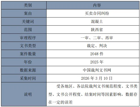 2025年已经过去,预拌混凝土行业在复杂艰难的经济与市场环境中继续前行。为总结过去一年的司法实践,揭示行业风险,指导企业健康发展,本报告通过对2025年度陕西省范围内预拌混凝土相关纠纷裁判文书进行系统性检索与分析,结合行业特点,总结普遍性问题的司法裁判观点,并就关键风险点提出防控建议。