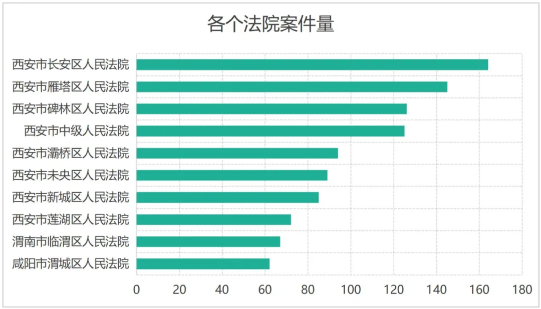 西安的案件量依然占据着多数。西安市长安区人民法院的案件数量164件占比最大,其次是西安市雁塔区人民法院,而西安市莲湖区人民法院的案件数量占比最小。