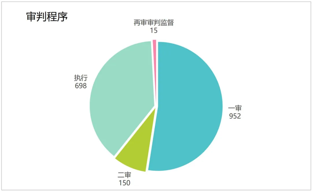 一审依然是化解矛盾的主战场。一审程序占比52%,案件进入二审程序的占比8.2%、再审程序占比0.8%,进入执行程序的案件达到了38%。