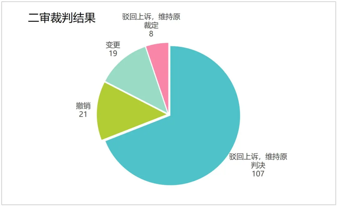 二审维持的概率依然很高。二审裁判结果中维持原判判决及裁定的占比为69%,变更的占到13%。