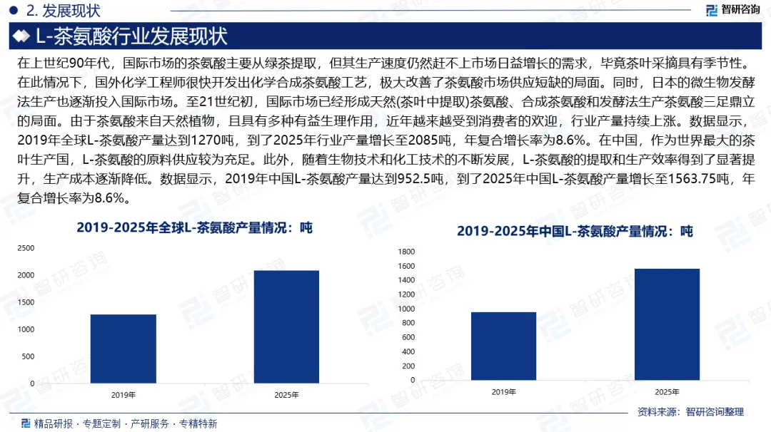 L-茶氨酸也叫茶氨酸,是一种天然存在于茶叶(尤其是绿茶和部分食用菌)中的独特非蛋白质氨基酸,也是茶叶呈味物质之一。茶氨酸具有多种生物活性功能,例如,缓解疲劳、保护神经细胞、抗氧化、缓解焦虑、安神等功效,同时茶氨酸还具有促进脑细胞发育、改善脑功能、抗菌、抗炎等功效。中国L-茶氨酸近年来得到快速发展,这得益于消费者对健康生活方式的追求和茶叶市场的不断扩大。L-茶氨酸作为一种重要的茶叶提取物,具有多种健康益处,如抗氧化、抗炎、抗抑郁等,因此受到了广泛的关注。随着人们对健康食品和营养补充剂需求的增加,L-茶氨酸的市场需求也随之增长。同时,中国是世界最大的茶叶生产国,L-茶氨酸的原料供应较为充足。此外,随着生物技术和化工技术的不断发展,L-茶氨酸的提取和生产效率得到了显著提升,生产成本逐渐降低。这些因素共同推动了茶氨酸行业的快速发展,也为行业未来的增长奠定了坚实基础。数据显示,2019年中国L-茶氨酸产量达到952.5吨,到了2025年中国L-茶氨酸产量增长至1563.75吨,年复合增长率为8.6%。