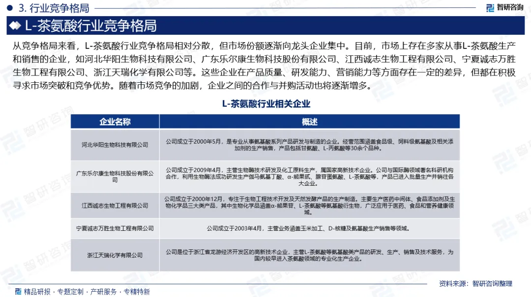 企业格局:从竞争格局来看,L-茶氨酸行业竞争格局相对分散,但市场份额逐渐向龙头企业集中。目前,市场上存在多家从事L-茶氨酸生产和销售的企业,如河北华阳生物科技有限公司、广东乐尔康生物科技股份有限公司、江西诚志生物工程有限公司、宁夏诚志万胜生物工程有限公司、浙江天瑞化学有限公司等。这些企业在产品质量、研发能力、营销能力等方面存在一定的差异,但都在积极寻求市场突破和竞争优势。随着市场竞争的加剧,企业之间的合作与并购活动也将逐渐增多。