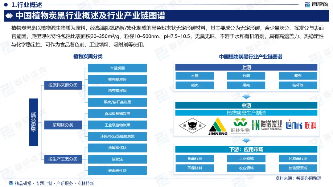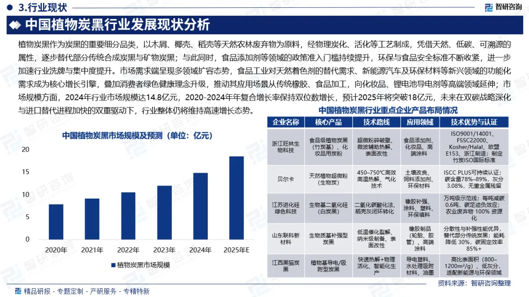 行业发展现状:植物炭黑作为炭黑的重要细分品类,以木屑、椰壳、稻壳等天然农林废弃物为原料,经物理炭化、活化等工艺制成,凭借天然、低碳、可溯源的属性,逐步替代部分传统合成炭黑与矿物炭黑;与此同时,食品添加剂等领域的政策准入门槛持续提升,环保与食品安全标准不断收紧,进一步加速行业洗牌与集中度提升。市场需求端呈现多领域扩容态势,食品工业对天然着色剂的替代需求、新能源汽车及环保材料等新兴领域的功能化需求成为核心增长引擎,叠加消费者绿色健康理念升级,推动其应用场景从传统橡胶、食品加工,向化妆品、锂电池导电剂等高端领域延伸;市场规模方面,2024年行业市场规模达14.8亿元,2020-2024年年复合增长率保持双位数增长,预计2025年将突破18亿元,未来在双碳战略深化与进口替代进程加快的双重驱动下,行业整体仍将维持高速增长态势。