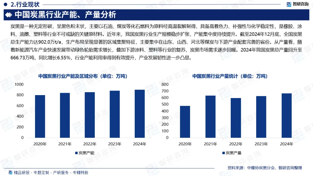 植物炭黑以农林废弃物为原料,经热解等工艺制成,具有天然低碳属性,正逐步替代部分传统炭黑;而传统炭黑以化石燃料为原料,是橡胶、涂料等行业的关键材料。近年来我国炭黑行业规模扩张,产能集中于山东、山西、河北三省,2024年总产能达902.0万吨/年,产量在经历2022年下滑后,于2024年回升至666.73万吨,同比增长6.55%。植物炭黑作为细分品类,受环保与食品安全标准提升推动,加速行业洗牌,市场需求多领域扩容,2024年市场规模达14.8亿元,预计2025年将突破18亿元。当前,我国植物炭黑企业技术布局呈现原料多元、工艺高端、应用差异化特征,头部企业聚焦高附加值产品,中小企业主攻中低端领域,同时加速智能化改造。未来,行业将沿技术升级、应用扩容、产业整合发展,工艺向绿色低碳迭代,应用向多元赛道延伸,产业加速整合,推动高质量发展与全球化进程。