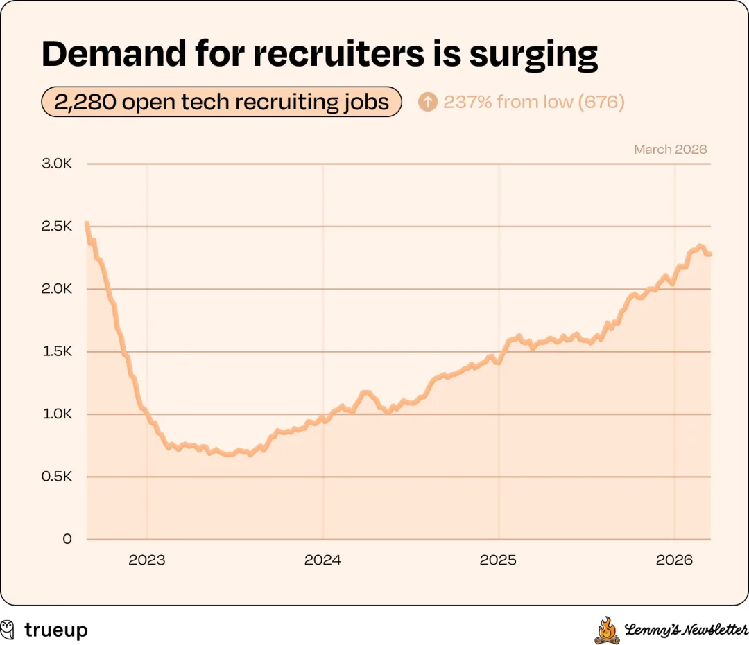 虽然数据十分乐观,但我知道很多人当下求职依旧艰难。岗位变多,并不意味着求职速度会自动加快。对处于这种困境的朋友,首先我深表理解;其次,我正在设法提供帮助。在此之前,可查看本文末尾我整理的一系列资源,能提升你拿到 offer 的概率。本次分析基于我长期合作的优质数据平台 TrueUp ,该平台追踪全球超 9000 家科技公司与头部初创企业的开放岗位,方便用户浏览职位。其数据仅覆盖科技公司岗位(即最抢手、薪资最高的岗位), 不含非科技公司与咨询机构岗位 。全球科技公司 产品经理开放岗位超 7300 个 ,且呈上升趋势。较 2023 年初低点增长 75%,较今年年初增长近 20%,为 2022 年以来最高水平。当前数据:7379 个产品经理开放岗位,较低点回升 79%。全球科技公司 工程师开放岗位超 67000 个 ,仅美国就有 26000 个。尚不确定 AI 究竟是减少了岗位还是创造了更多岗位,但今年年初以来,工程师岗位的增长速度进一步加快。当前数据:67665 个工程师开放岗位,较低点回升 78%。若你怀疑这一增长的真实性与持续性,可关注科技行业招聘专员需求的激增:开放招聘岗位数几乎回到 2022 年峰值。该岗位是疫情后受冲击最严重、也恢复最快的岗位。招聘规模随招聘需求同步增减,这一信号预示科技行业招聘需求将持续高位。当前数据:2280 个科技行业招聘开放岗位,较低点回升 237%。去年年中更新时,AI 岗位已快速增长,如今更是呈曲线式暴涨:当前数据:36686 个 AI 开放岗位,较低点回升 335%。- OpenAI、Anthropic、Cursor、Lovable 等 AI 原生公司的所有开放岗位
