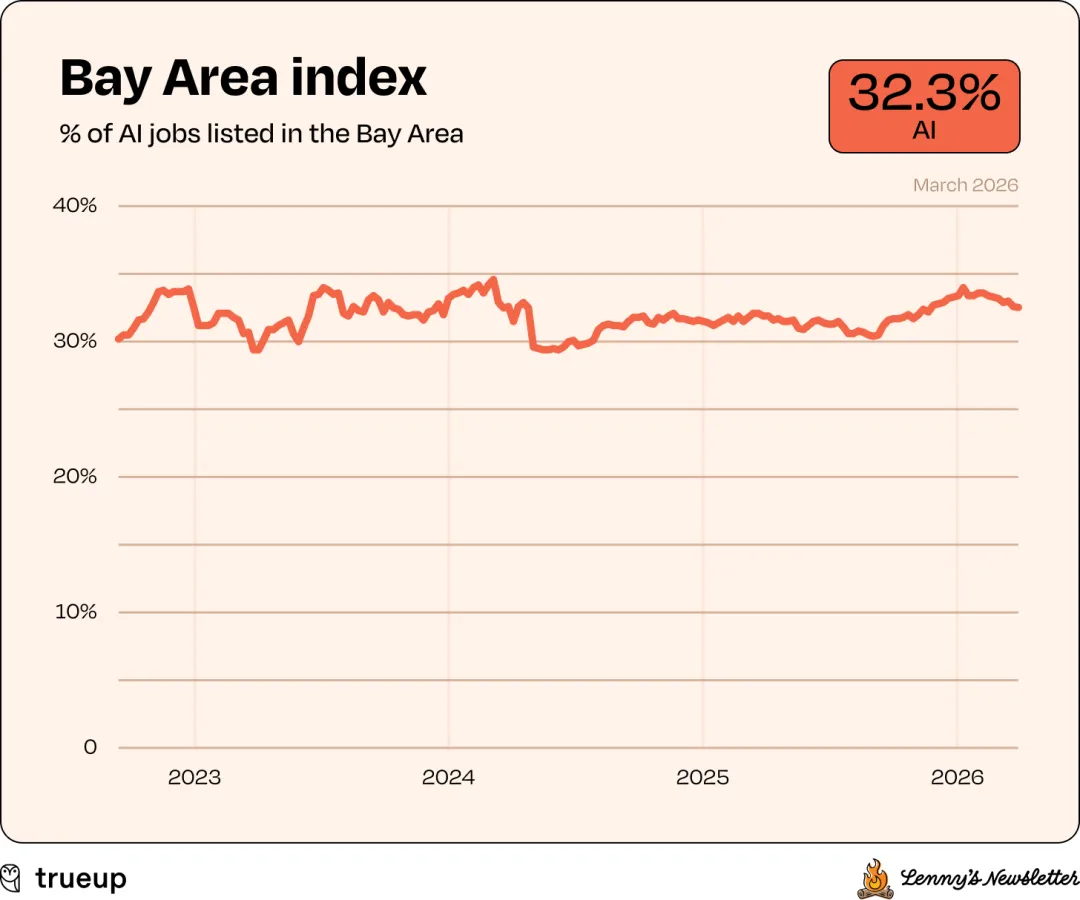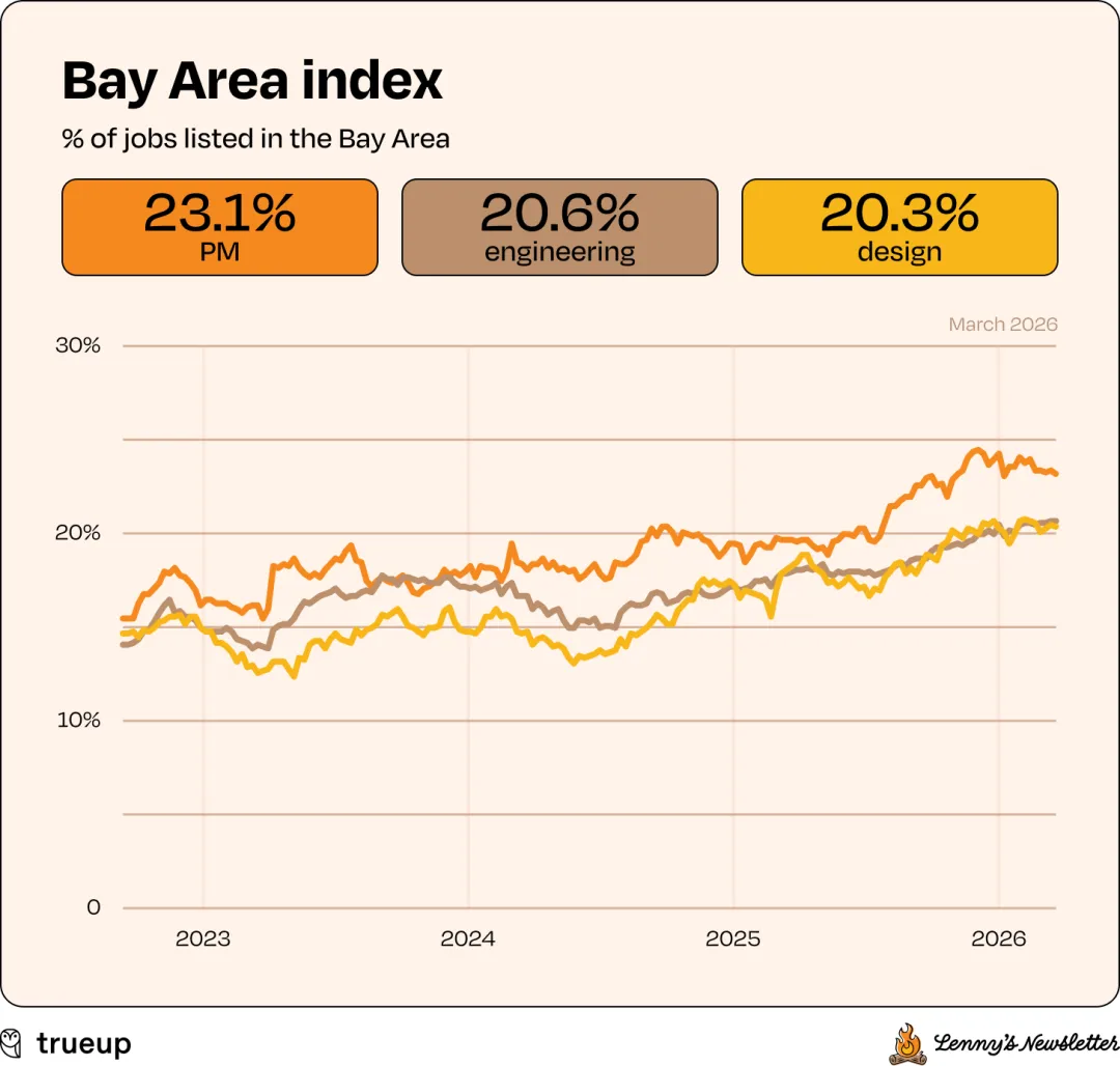 无论这是 AI 公司数量增加,还是头部 AI 公司扩招,当下都是投身 AI 领域的好时机。与产品经理、工程师不同,2023 年初以来设计岗位数量基本持平,全球仅约 5700 个,绝对数量低于前两者。当前数据:5716 个设计开放岗位,较低点回升 32%。我无法精准判断原因,但大概率与 AI 相关。ChatGPT 发布两年后的 2024 年,产品与工程师岗位开始增长,设计岗位却未同步。我的推测是:AI 让工程师能够快速迭代,传统设计流程的参与空间与需求都在减少。近期也有推文提及这一趋势。但从逻辑上讲,产品竞争愈发激烈,设计本应成为差异化优势,这一点值得企业思考。我们会持续跟踪该趋势,以及 AI 对组织设计的整体影响。进一步分析发现一个关键变化:产品经理与设计师的需求比例反转。2023 年年中,设计师岗位数量反超产品经理,此后产品经理需求持续领先,当前比例为 1.27:1 。这也是 AI 重塑组织架构的重要观察点。旧金山湾区长期占据科技岗位最高份额,且这一比例仍在上升:- 产品经理岗位:湾区占比超 23%(2022 年以来增长 50%)
