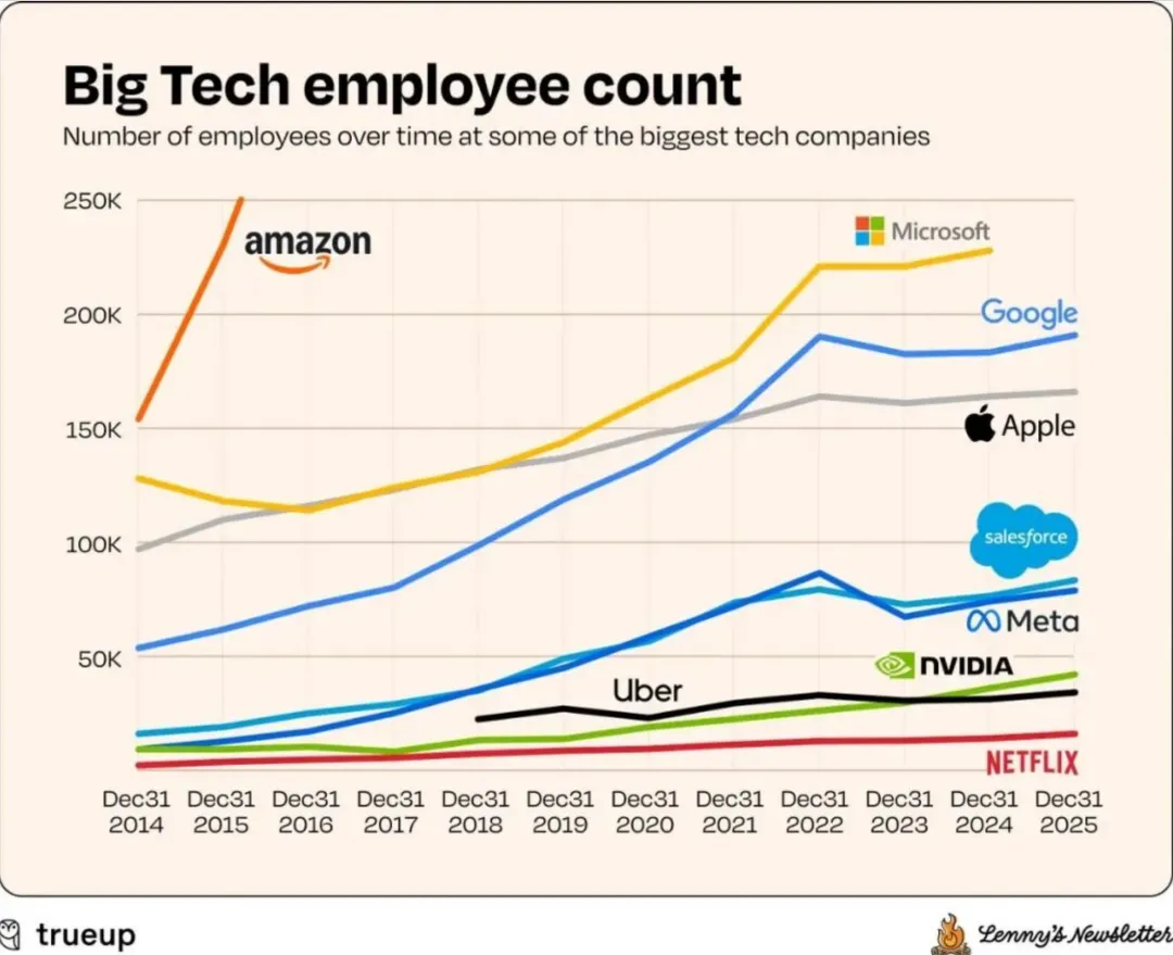 2022 年是远程办公岗位的巅峰时期,当时约 35% 的 PM 岗位、26% 的工程师岗位和 28% 的设计岗位在招聘信息中注明支持远程办公。各类岗位的远程办公比例相比峰值下降了 20% 到 25%。这个新常态至少意味着,远程办公作为一种选择确实存在且会长期持续(尽管规模比很多人期望的要小),但其中许多机会仍然附带国家、地区和时区的限制。注:过去一个月 PM 和设计类的远程岗位出现了一波小幅回升,我预计会回落 —— 但如果没有回落,那在下一次报告中就更值得深挖了!2026 年至今,科技公司已发生 184 次裁员,波及 57,606 人。2025 年全年有 783 次裁员,影响 245,953 人(平均每天 674 人)。虽然今年可能感觉情况更严峻了,但按目前的节奏来看,今年的裁员规模和过去两年大致相当。最关键的一点是:尽管裁员新闻不断,大多数大型科技公司的人员编制与去年相比基本持平甚至略有增长。把今年的开放职位数据和裁员数据放在一起看,它们实际上在讲述一个科技行业增长的故事 —— 尽管头条新闻给人的感觉恰恰相反。是的,裁员确实在发生,今年很可能还会继续。这是真实存在的压力,每个在职的人有所担忧都完全可以理解。但招聘正在强劲回升,目前来看增速正在超过裁员的速度。如果招聘人员需求的增长能作为先行指标的话,这种势头很可能还将延续。随着团队和公司不断转型,成功所需的技能组合也在改变,我们看到的或许真的是一场人员洗牌,而非裁减。对于科技行业职业发展的未来,有充分的理由保持乐观。终身学习 专注AI分享