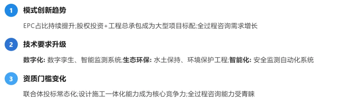 ? 模式优势: 股权投资+EPCO模式能够整合资金、设计、施工、运营全链条资源,降低项目风险,提高运营效率,成为大型水利项目的首选模式。