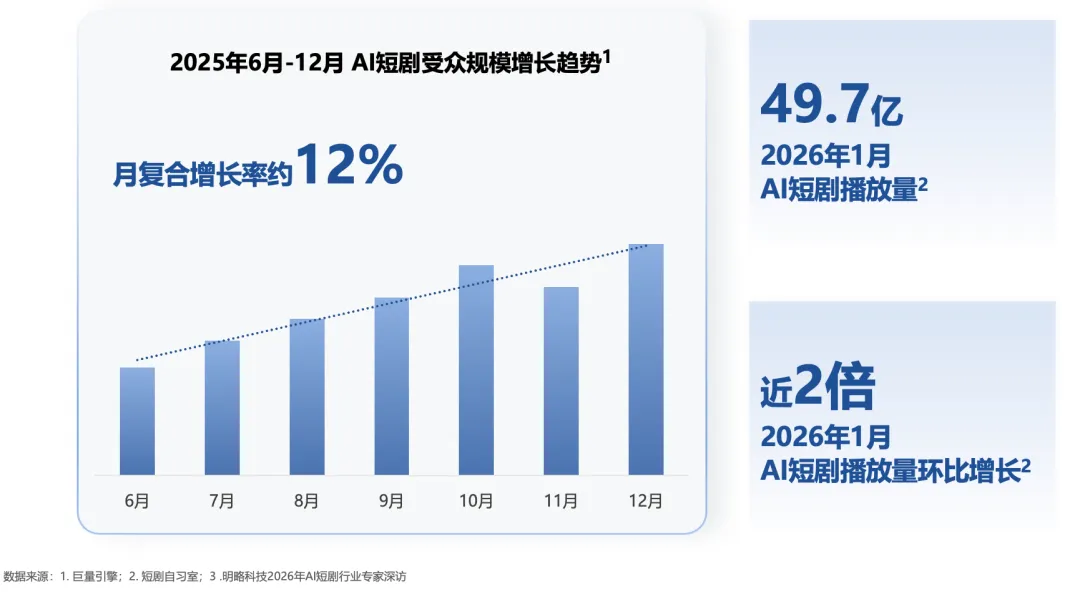 巨量引擎数据显示,2025年6月以来,AI短剧受众规模持续快速增长,月复合增长率达到12%;2026年1月AI短剧播放量环比增长近2倍。
