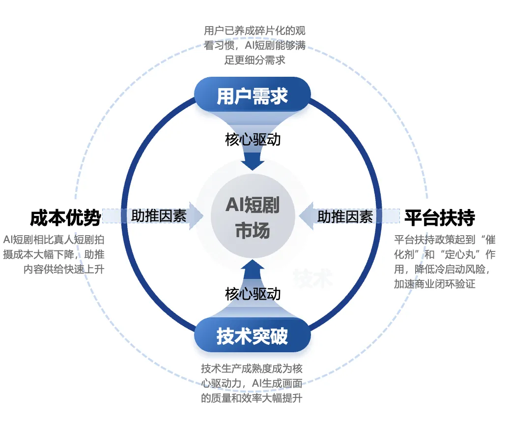 报告发现,AI短剧市场的快速发展,离不开多重要素的共同作用:需求与技术是两大核心驱动力,成本与政策是两大重要助推因素。
