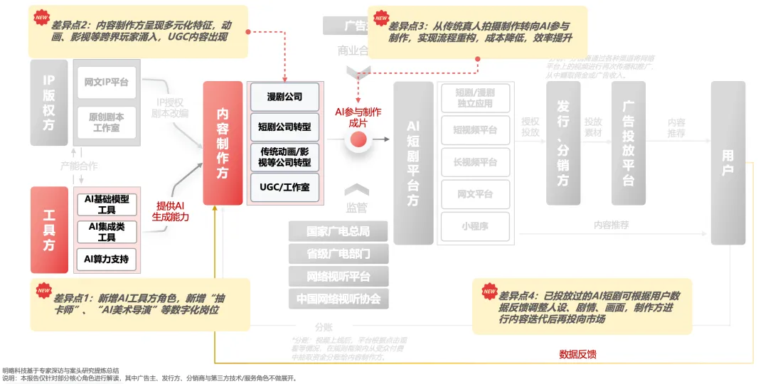 变化1: 新角色登场。AI工具方作为新角色正式登场,“抽卡师”、“AI美术导演”等全新数字化岗位随之涌现,AI短剧正在形成自己独特的工种体系。