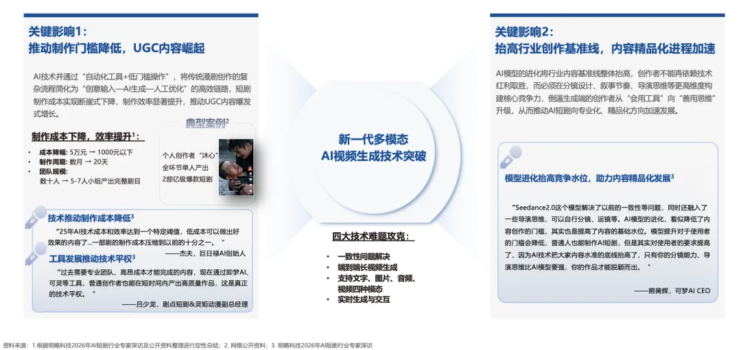 技术层面,AI技术突破是AI短剧市场爆发的根本驱动力。2026年Seedance 2.0、可灵AI 3.0等技术的革命性突破,攻克了角色一致性、端到端长视频生成等核心难题,推动行业进入AI原生视频时代。
