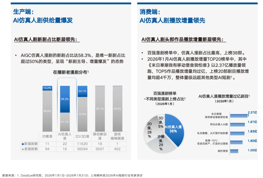 随着技术成熟,AI仿真人剧的画面质量和情感表达能力持续提升,呈现出“新剧主导、增量爆发”的态势,在供给端和消费端同步展现出领先的增长势能,正在成为最具增长潜力的内容形态。