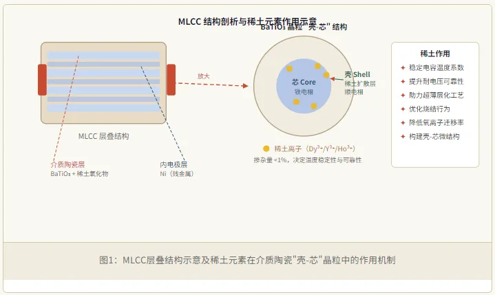 【稀土在MLCC介质陶瓷中的核心功能】 ① 在钛酸钡晶体中构建"壳-芯"(Core-Shell)微观结构,使介电常数随温度变化趋于平稳;② 通过调控晶格参数和离子半径匹配,抑制相变诱发的电容漂移;③ 降低氧离子迁移率,提升耐电压性能与长期可靠性;④ 改善烧结行为,助力MLCC向纳米级薄层化(≤0.5μm)演进。 |