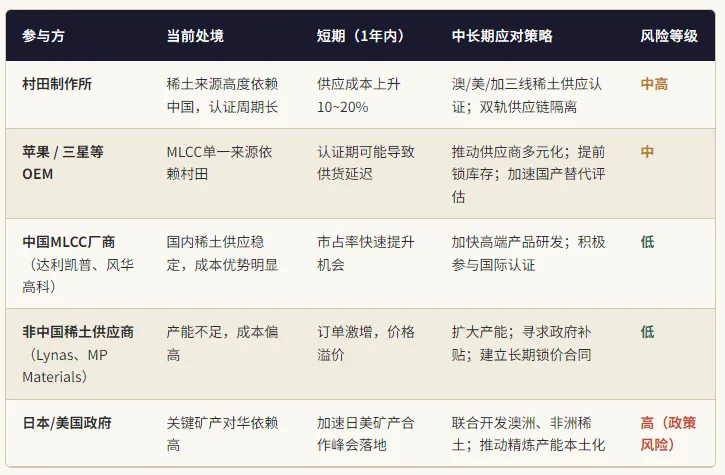 ●"双轨制"供应链架构普及:不仅是村田,TDK、太阳诱电(Taiyo Yuden)等日系电容厂商,以及三星电机等均会被迫建立面向"中国市场"和"非中国市场"的独立物料体系,增加管理复杂度,但也降低了单一风险敞口。