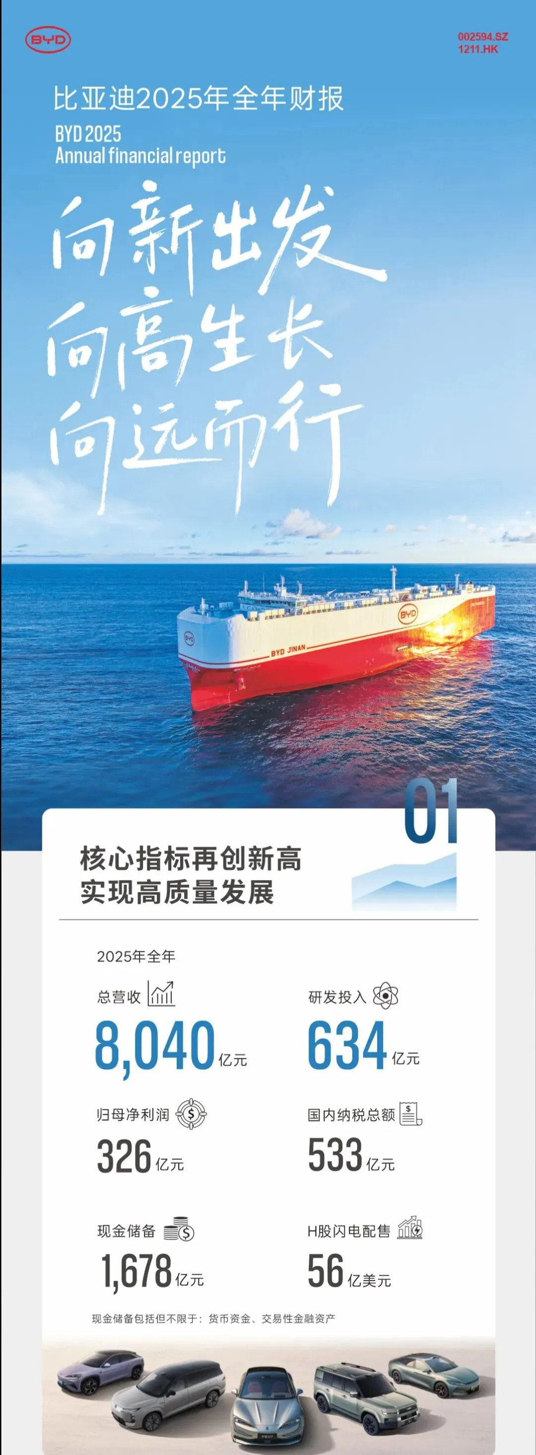 比亚迪发布了2025年全年财报,数据可谓非常亮眼,其中,总营收8040亿元,归母净利润326亿元,研发投入634亿元,国内纳税总额533亿元,现金储备1678亿元,H股闪电配售56亿美元。