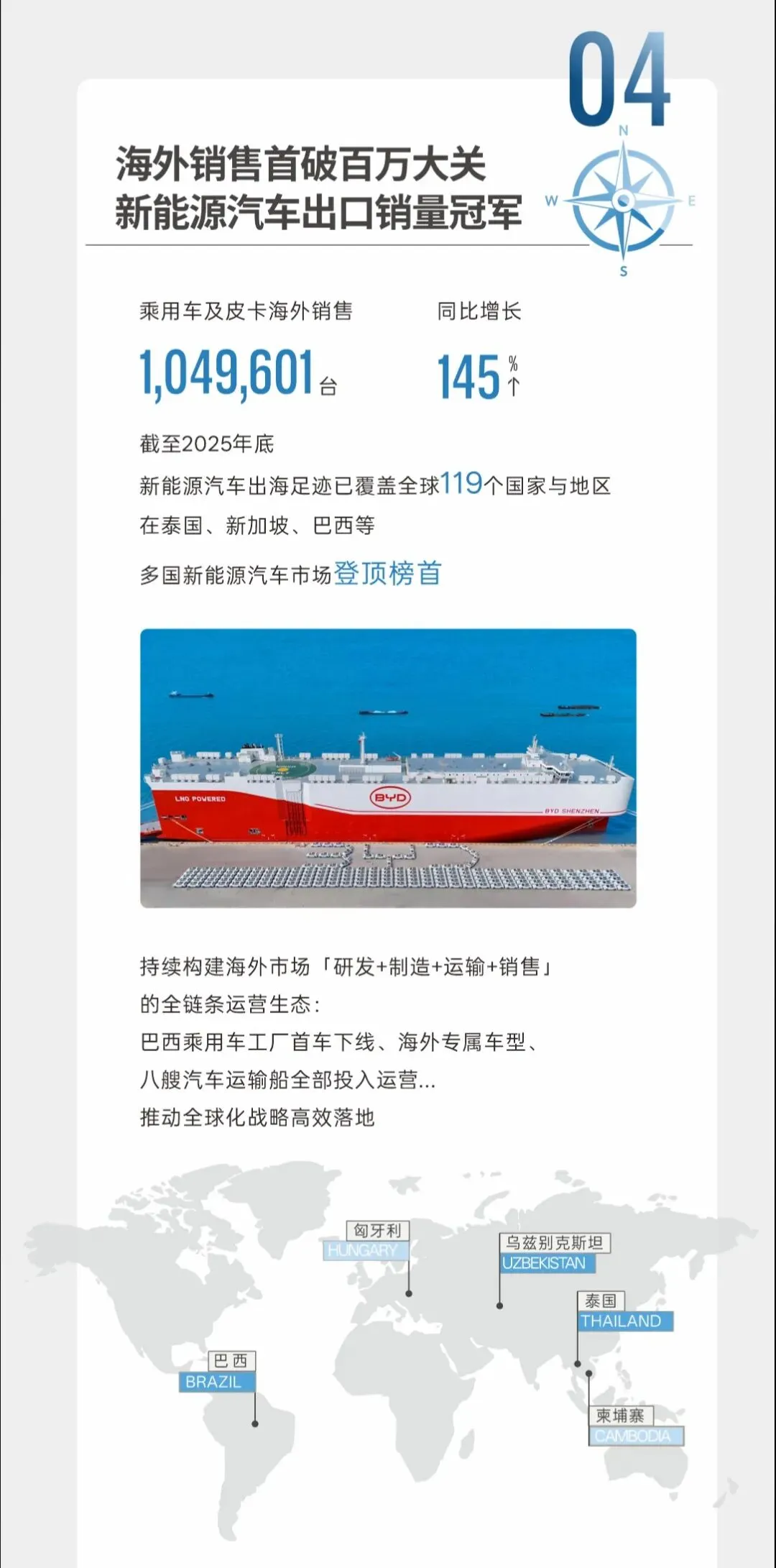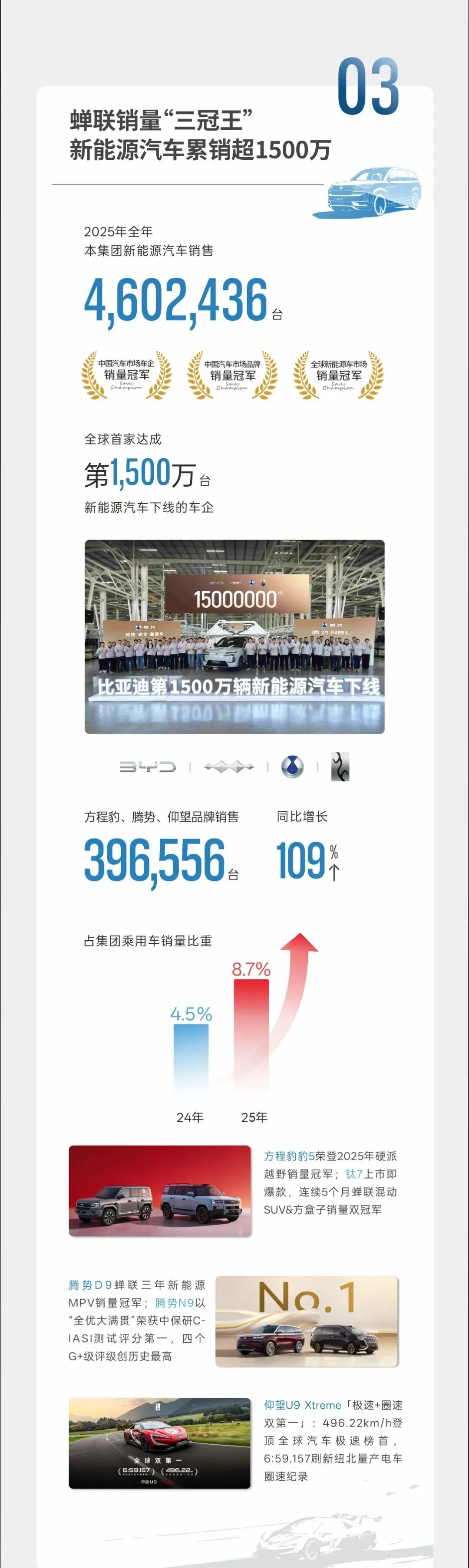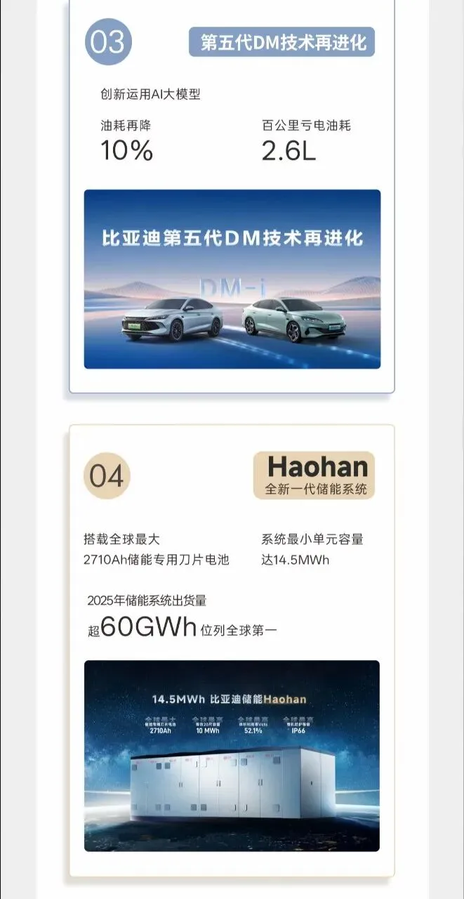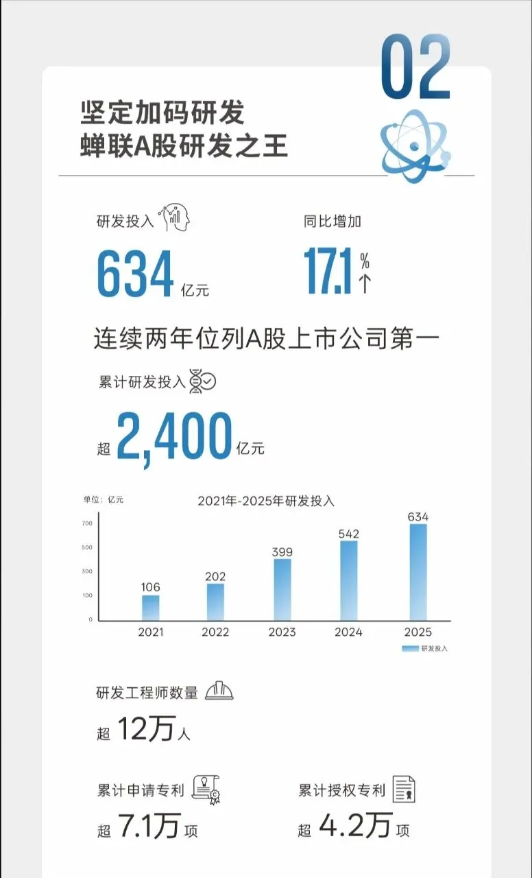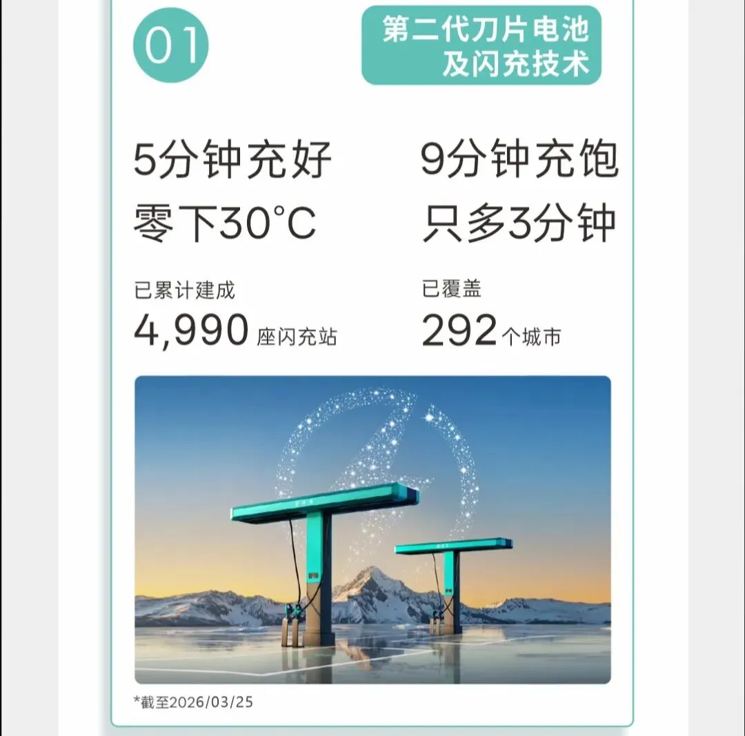 众所周知,一个车企的技术需要不断的研发投入,而比亚迪25年投入634亿元,同比增加17.1%,连续两年位列A股上市公司第一,累计研发投入超2400亿元,研发工程师数量达到了12万人,累计申请专利超7.1万项,累计授权专利超4.2万项。26年推出的领先行业的技术主要有:1.二代刀片电池+闪充技术,5分钟充好,9分钟充饱,零下30度只多3分钟,将充电速度带到新的高度,并且比亚迪的闪充站自发布后建站迅速,目前已累计建成4990座闪充站,已覆盖292个城市。2.比亚迪的天神之眼辅助驾驶系统,自去年发布天神之眼之后,搭载天神之眼辅助驾驶系统的车型保有量超270万辆,保有量中国车企第一,日均生成数据1.7亿公里,算法持续迭代,并且比亚迪将在4月份发布智能化技术,智能驾驶预计将会更上一层楼。3.第五代DM技术再进化,创新运用AI大模型,油耗再降10%,百公里亏电油耗只有2.6L。4.HaoHan全新一代储能系统,搭载全球最大2710Ah储能专用刀片电池,系统最小单元容量达14.5MWh,2025年储能系统出货量超60GWh位列全球第一。比亚迪2025年新能源汽车销售4602436台,蝉联销量三冠王,新能源汽车累销超1500万辆,也是全球首家达成第1500万台新能源汽车下线的车企,旗下的中高端品牌方程豹、腾势、仰望品牌销售396556辆,同比增长109%,占集团乘用车销量比重为8.7%,最具代表车型有豹5、钛7以及腾势D9。除了国内市场表现亮眼,海外销售也首破百万大关,成为新能源汽车出口销量冠军,25年乘用车及皮卡海外销售1049601台,同比增长145%,截止2025年底,新能源汽车出海足迹已覆盖全球119个国家与地区,在泰国、新加坡、巴西等多国新能源汽车市场登顶榜首,比亚迪八艘汽车运输船全部投入运营。比亚迪践行可持续发展理念,为地球降温1摄氏度,2025年全年新能源汽车实现减碳4660万吨,相当于植树约7.8亿棵。作为新能源汽车界的一哥,比亚迪的动作将直接影响着电动化的方向,践行以科技为主的车企,在这个时代终将不会被淘汰。