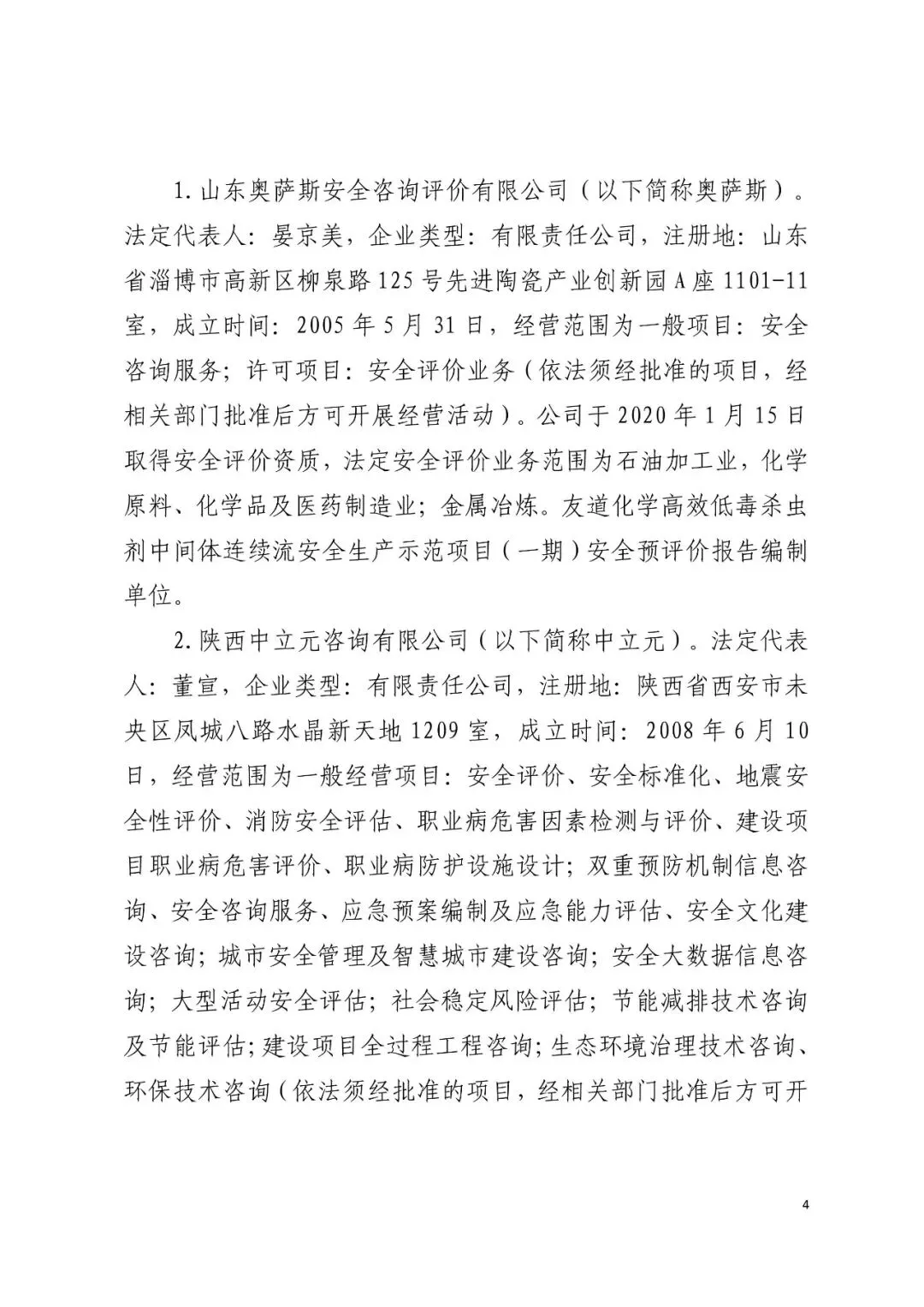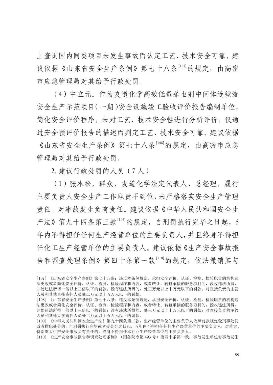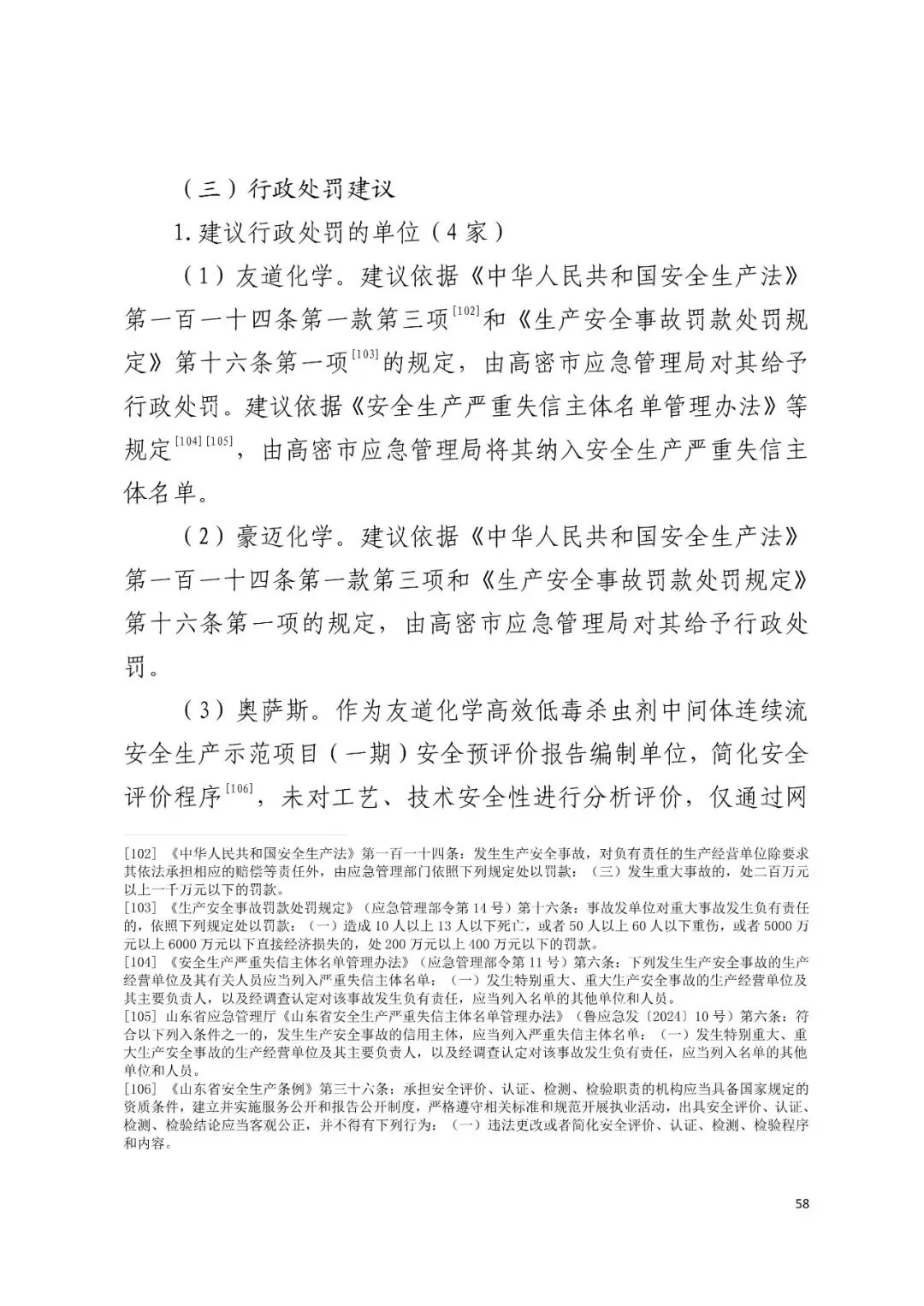 对友道化学、豪迈化学、奥萨斯、中立元等4家企业给予行政处罚;对友道化学法定代表人、总经理张本松,豪迈化学总经理王钦峰,友道化学生产二部三车间主任尚先鹏,友道化学生产二部部长王鹏,友道化学工程管理中心主任郭洪金,奥萨斯评价师王国明,中立元评价师李建飞等7人给予行政处罚。