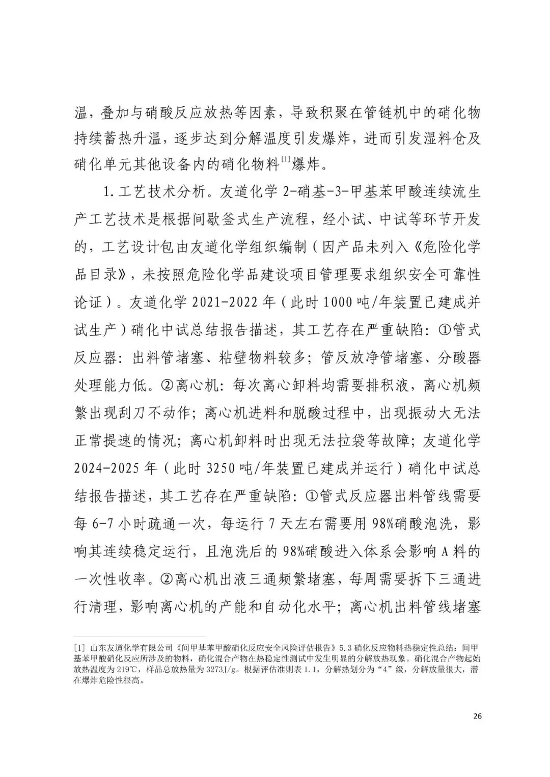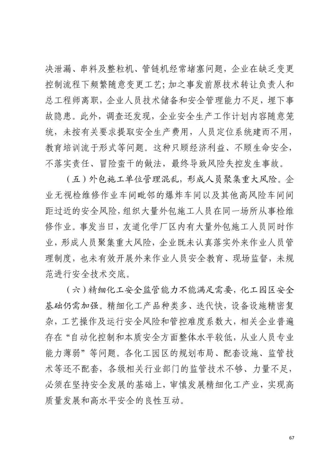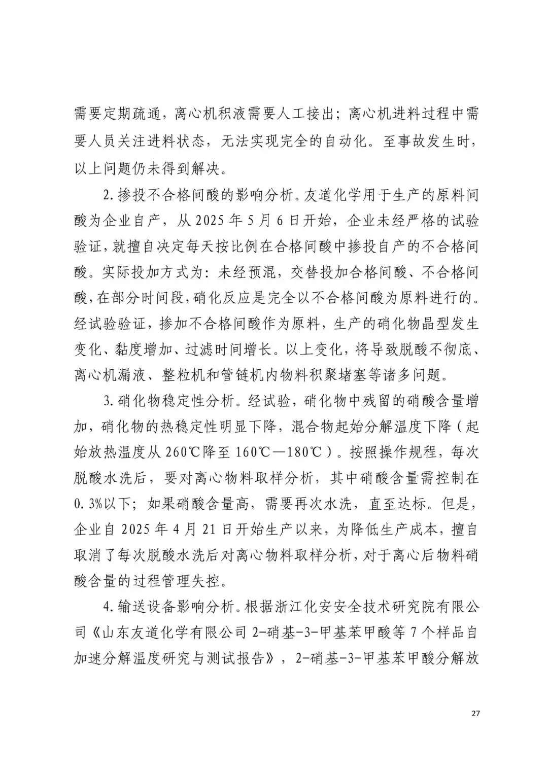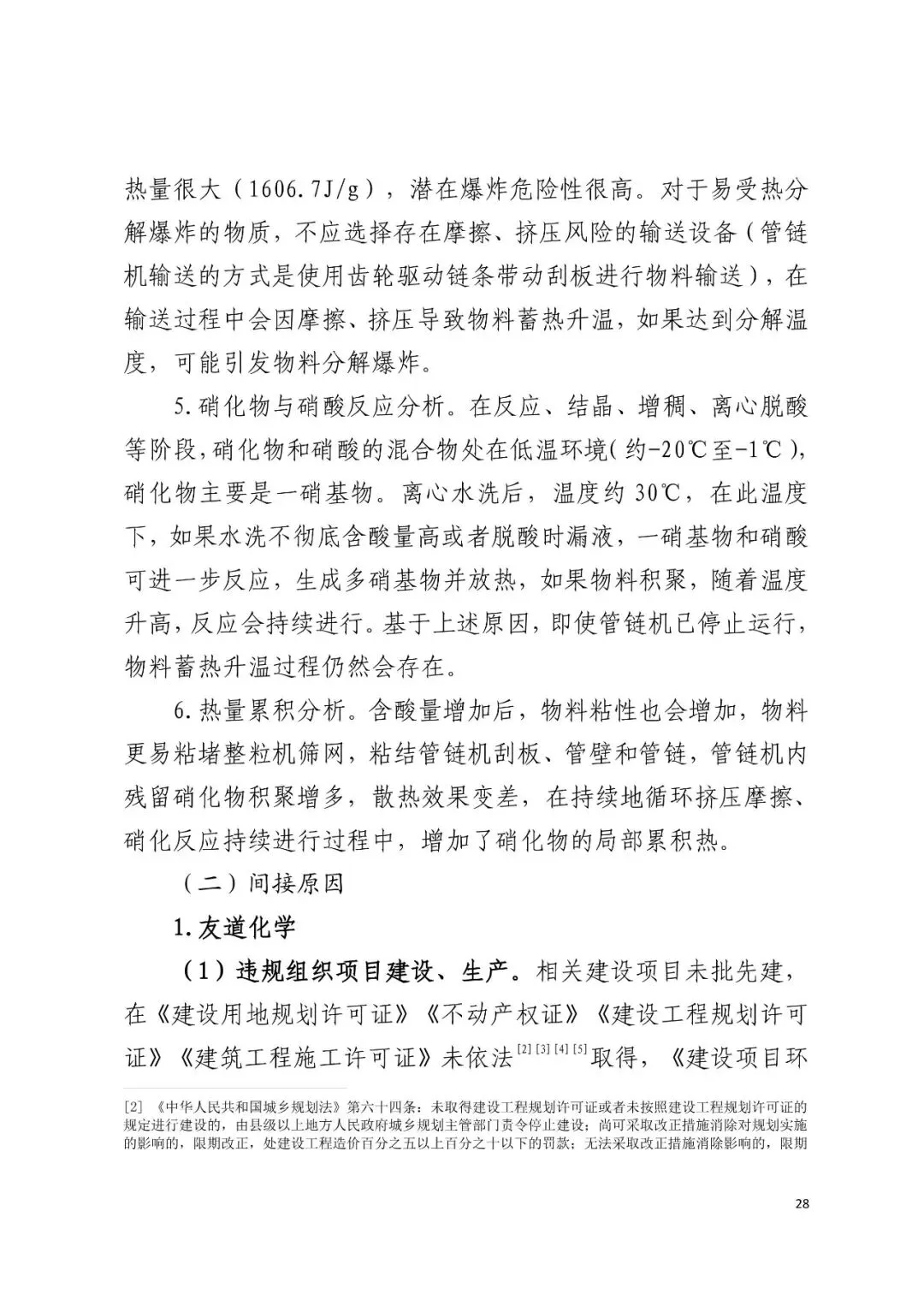 二、同意事故调查组对事故的原因分析和责任认定。潍坊高密山东友道化学有限公司“5·27”重大爆炸事故是一起因工艺技术有缺陷、擅自使用不合格原料、物料输送设备选型不当、风险管控措施缺失、隐患排查治理流于形式、违规组织项目建设生产,属地党委、政府和有关部门履职不到位,造成的重大生产安全责任事故。